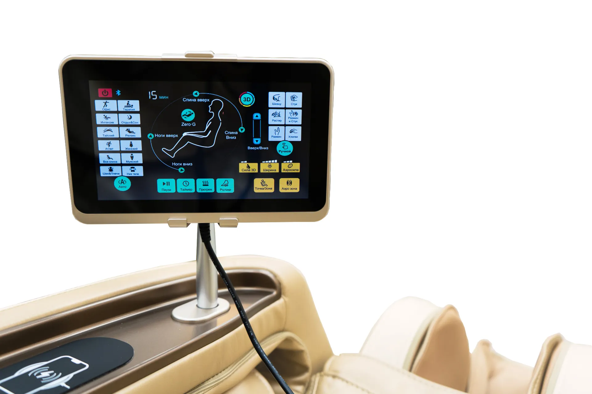 Беспроводная зарядка установлена на подлокотнике кресла