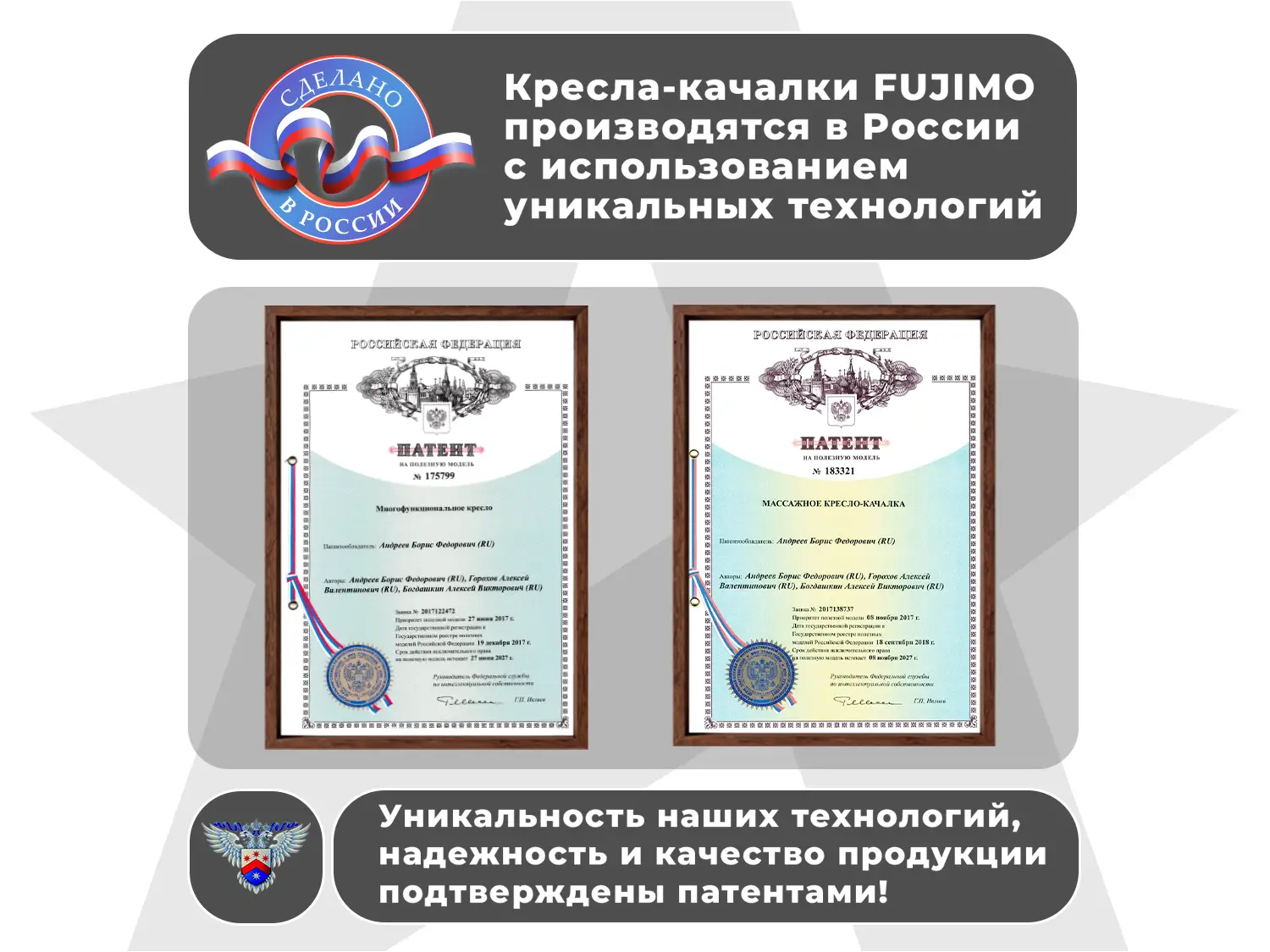 Сертификат: https://relaxa.ru//upload/iblock/f94/d7npxjnn1a35byp6h3ed3v82g5bukghq/Sertifikat-2021_2026-EGO_OTO_FUJIMO.pdf