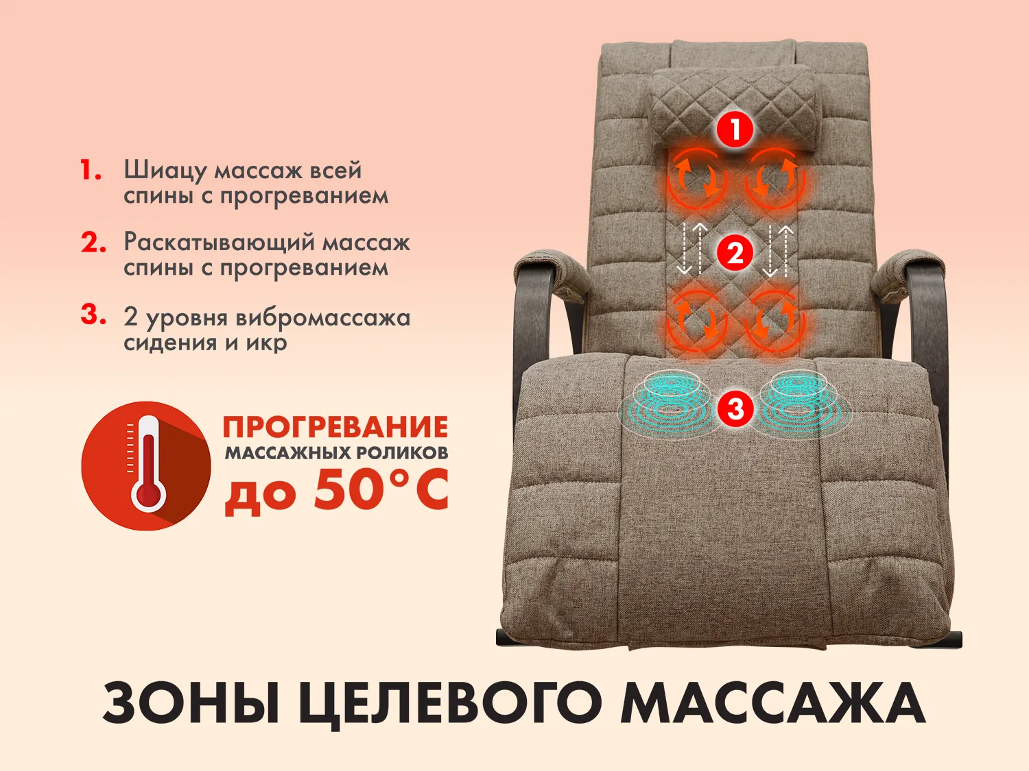 Поставляется напрямую от производителя, гарантия 1 год, дальнейший сервис Широкое, мягкое сиденье и мягкие подлокотники обеспечивают высокий комфорт Массажный механизм FUJIMO эффективно прорабатывает плечи, спину, ягодицы и икры Техника разминающего и раскатывающего массажа имитирует касание человеческих рук Сочетание массажа и плавного раскачивания позволяет достичь полного расслабления 3 автоматических программы многоуровневого массажа спины Функция прогрева массажных роликов усиливает эффект массажа 2 ритма вибрационного массажа в области сиденья и икр Прочный деревянный каркас выдерживает повышенную нагрузку 140 кг Внешние элементы каркаса отделаны натуральным шпоном вишневого оттенка Проводной пульт управления хранится в боковом кармане кресла Стеганый дизайн, с использованием рогожки TONY имеет оригинальную фактуру Обивка кресла износостойкая, не требует особого ухода и легко очищаетсяВНИМАНИЕ
