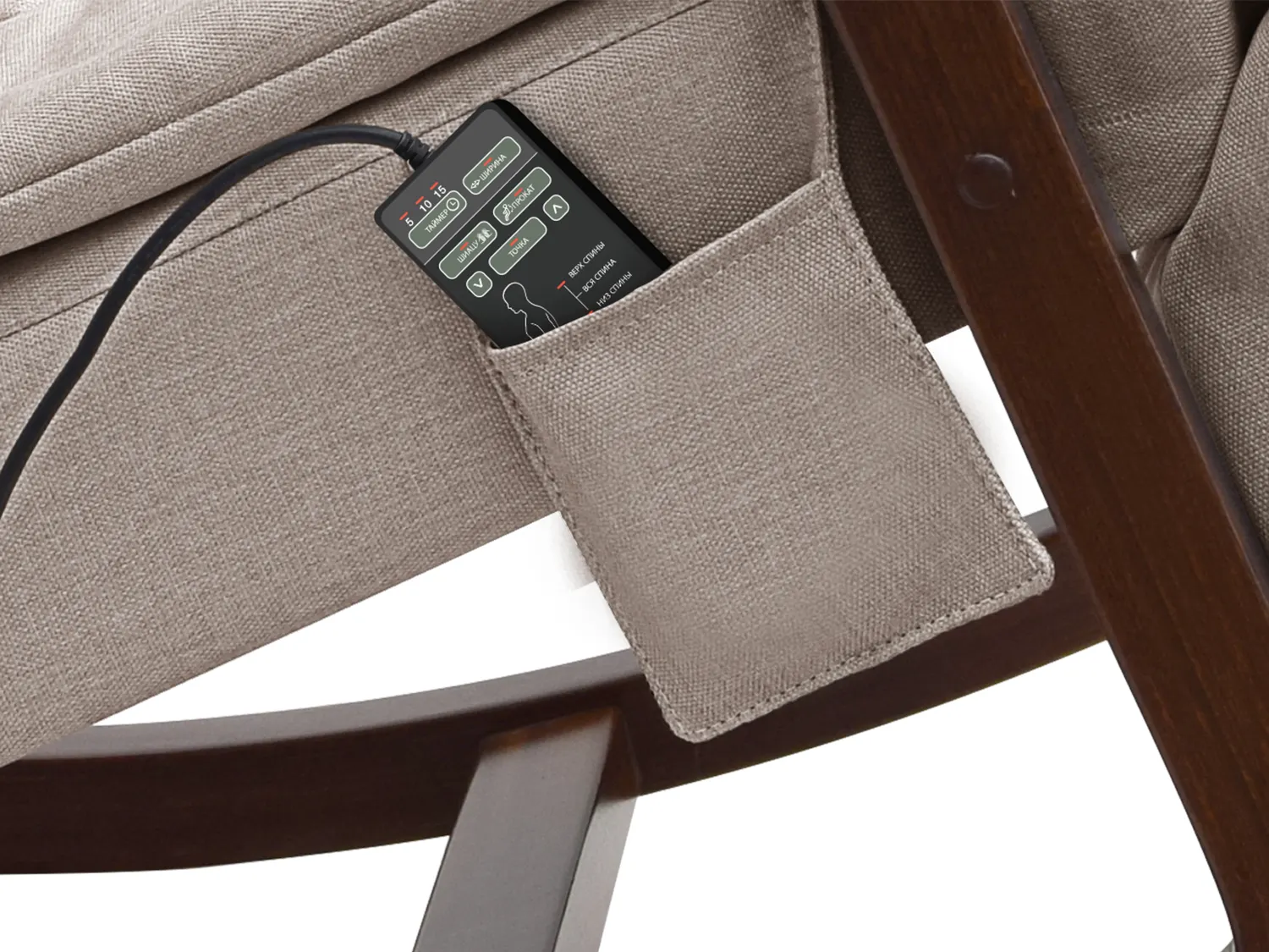 Пульт управления размещается в удобном кармане на подлокотнике кресла