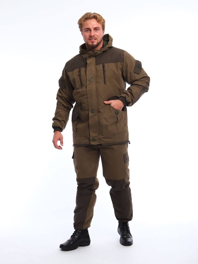 Демисезонный костюм утеплённый синтепоном, создан для комфортной носки в межсезонье. Подкладка дополнена флисовыми вставками в областях повышенного тепла и комфорта: в куртке — жилетная зона, воротник, капюшон и мешковина накладного кармана; в полукомбинезоне — нагрудник и верхняя часть задних половинок, включая сидение. Костюм отделан однотонной тканью аналогичного состава, а все элементы укомплектованы фурнитурой премиум-класса. Куртка имеет удлинённый прямой силуэт, центральную бортовую молнию с ветрозащитной планкой на клёпках и контактной ленте, верхние подрезные карманы на молнии с листочкой и скошенным входом, нижние накладные карманы с центральной встречной складкой и фигурным клапаном на клёпке. Кокетка полочки плавно переходит в кокетку спинки без плечевого шва; полочки декорированы зигзагообразными рельефами. По линии талии на спинке расположена кулиска с эластичным шнуром, концы которого выведены внутрь для аккуратной регулировки посадки.