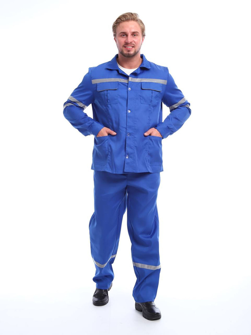 Мужской медицинский костюм включает куртку с длинными рукавами и отложным воротником, застёгивающуюся на пуговицы для аккуратного внешнего вида и удобства при работе. Куртка оснащена двумя нагрудными карманами с клапанами на липучке и светоотражающей полосой (СОП 25 мм) для дополнительной безопасности в условиях недостаточной освещённости.