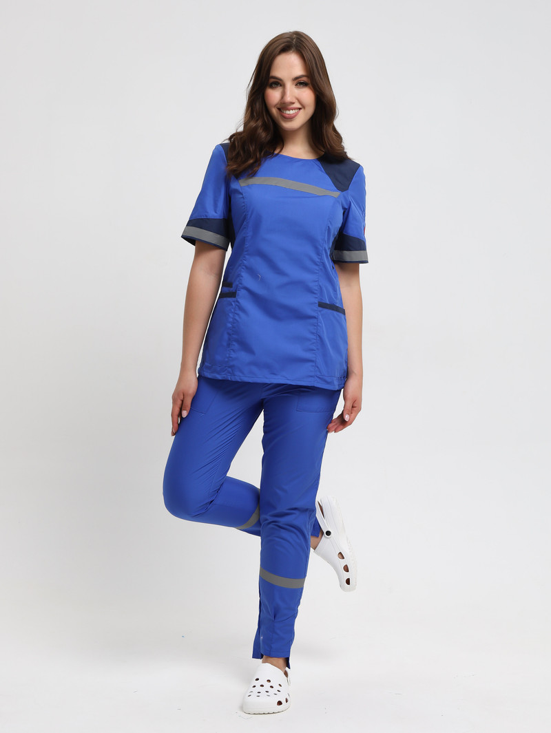 Модель костюма разработана специально для работников скорой помощи, сочетая безопасность, удобство и профессиональный внешний вид. Куртка приталенного силуэта средней длины выполнена с рельефами и цветными вставками; на полочках, спинке и рукавах нашиты светоотражающие ленты для повышенной видимости в условиях низкой освещённости. На одном рукаве пришит шеврон, а на спинке — крупный шеврон с надписью “скорая помощь”, что обеспечивает узнаваемость бригады на месте происшествия.