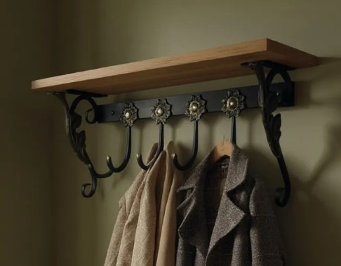 Элегантная настенная вешалка с удобной полкой — идеальное решение для прихожей, спальни или загородного дома. Конструкция сочетает функциональность и изысканный дизайн: металлические крючки с декоративными цветами и изящные кованые элементы создают атмосферу уюта и утонченности.