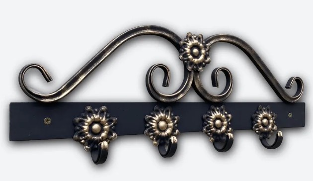 Элегантная настенная вешалка выполнена из прочного металла с декоративными элементами ручной работы в виде изящных завитков и объемных цветков.