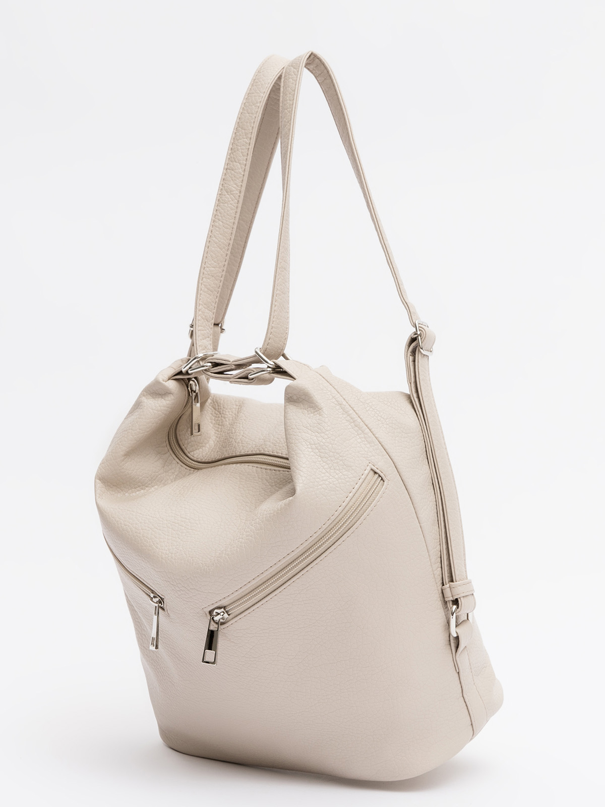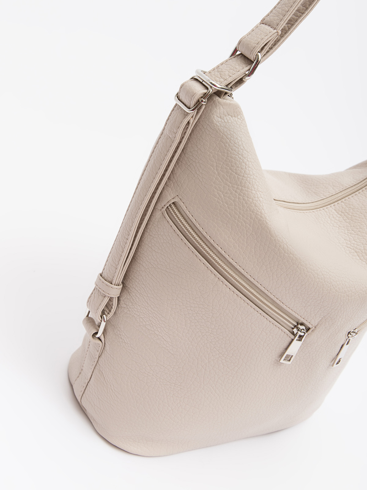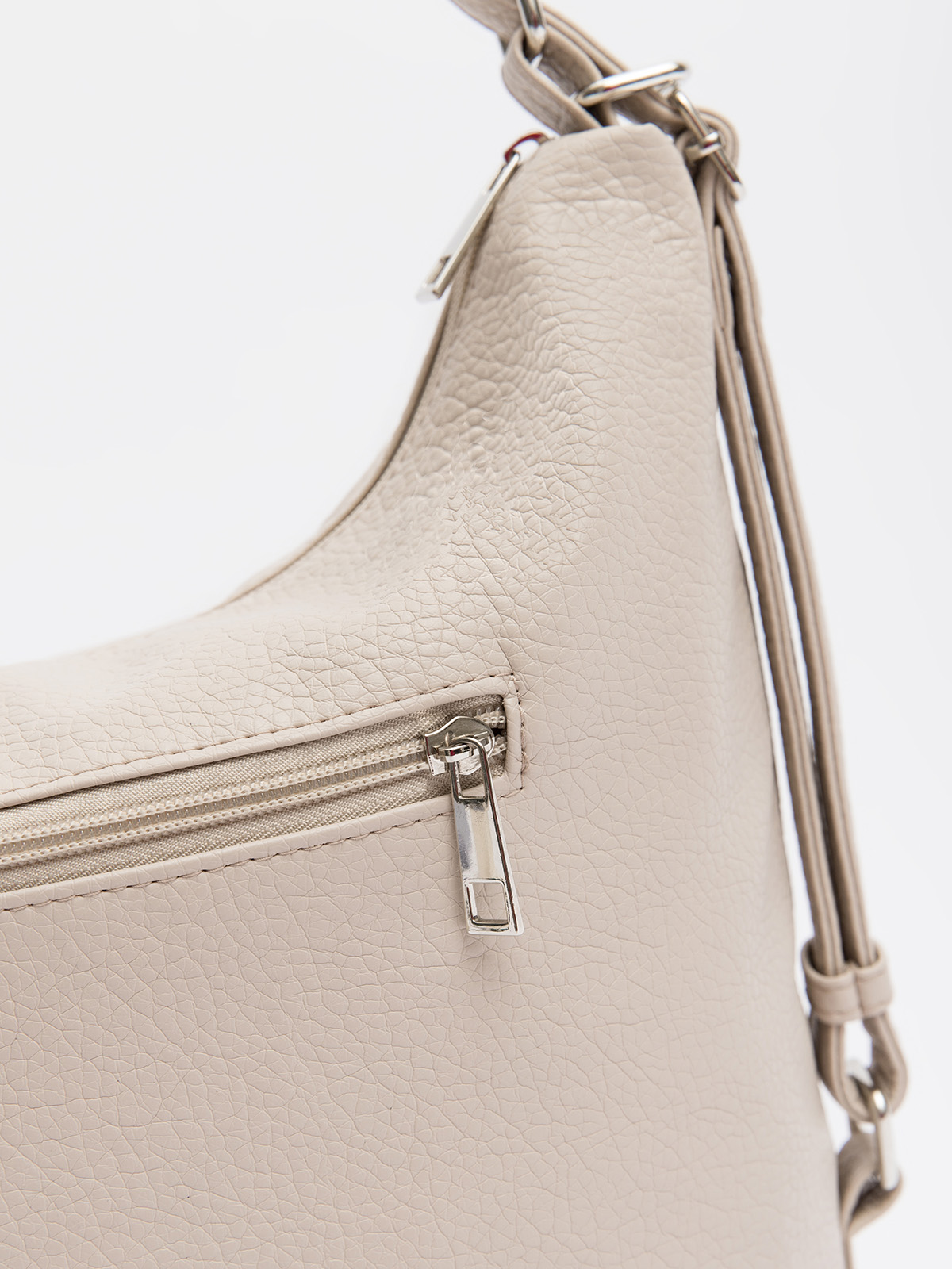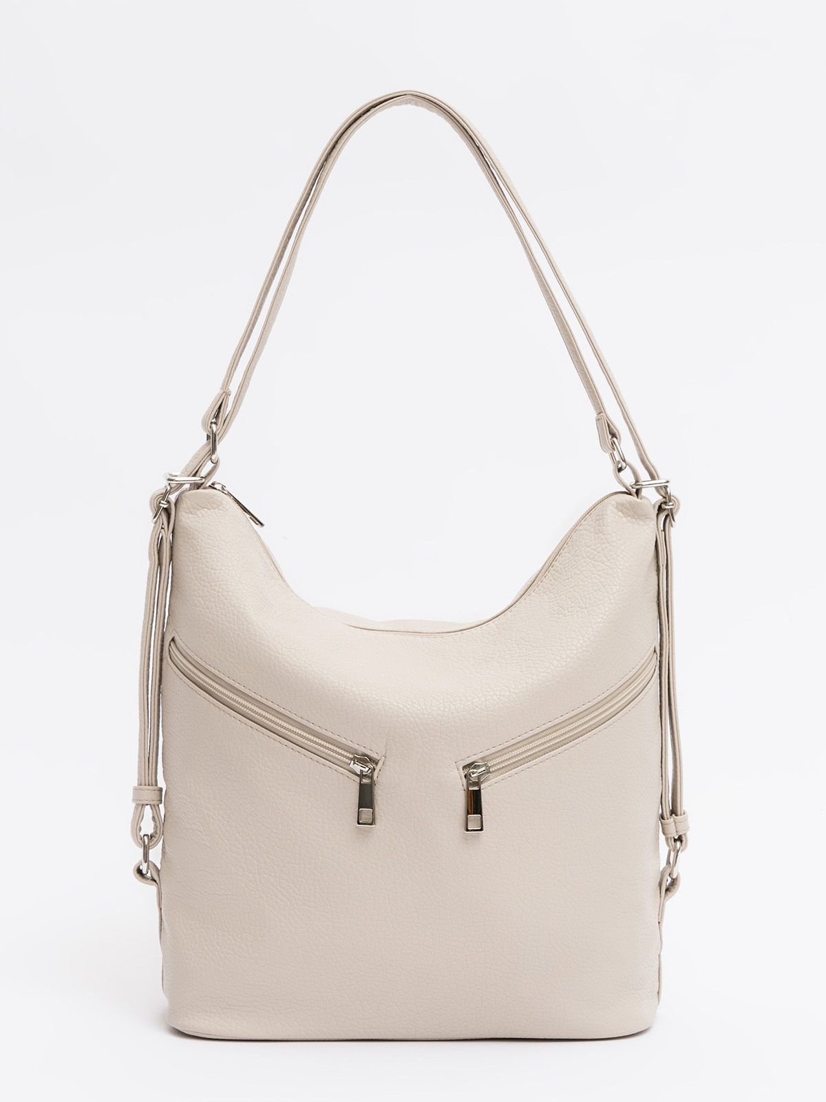 Мягкая форма легко превращается из стильного хобо в удобный рюкзак, подстраиваясь под ваши потребности. Просторное основное отделение с внутренней перегородкой-карманом и двумя диагональными карманами на молнии спереди обеспечивает идеальный порядок для всех вещей. Эти карманы не только функциональны, но и придают сумке современный динамичный вид. Незаменимый вариант для тех, кто ценит свободу выбора и практичность в каждой детали — носите её как угодно и куда угодно.