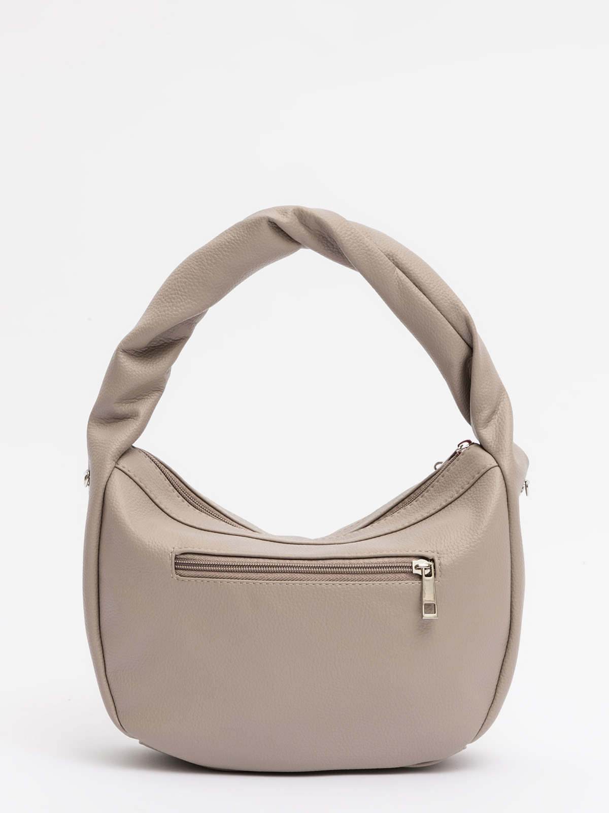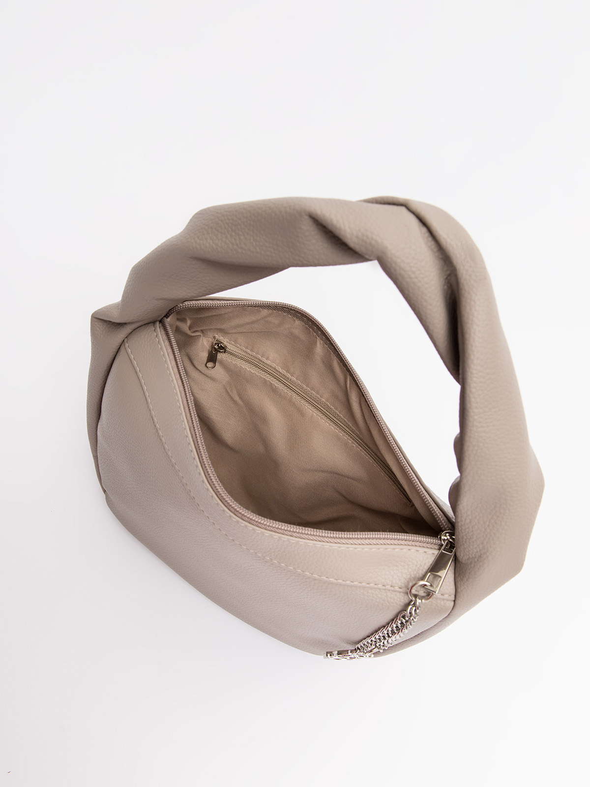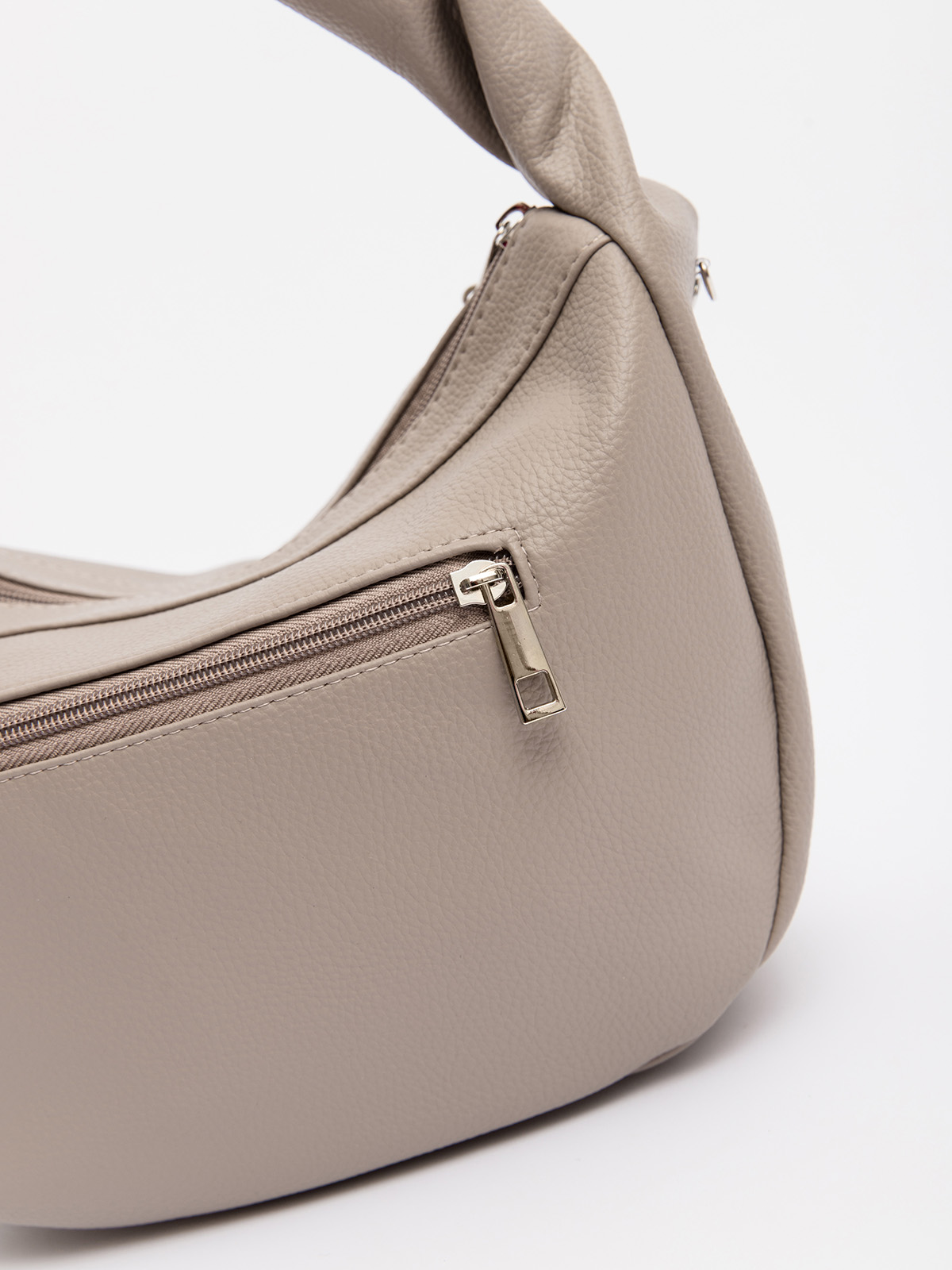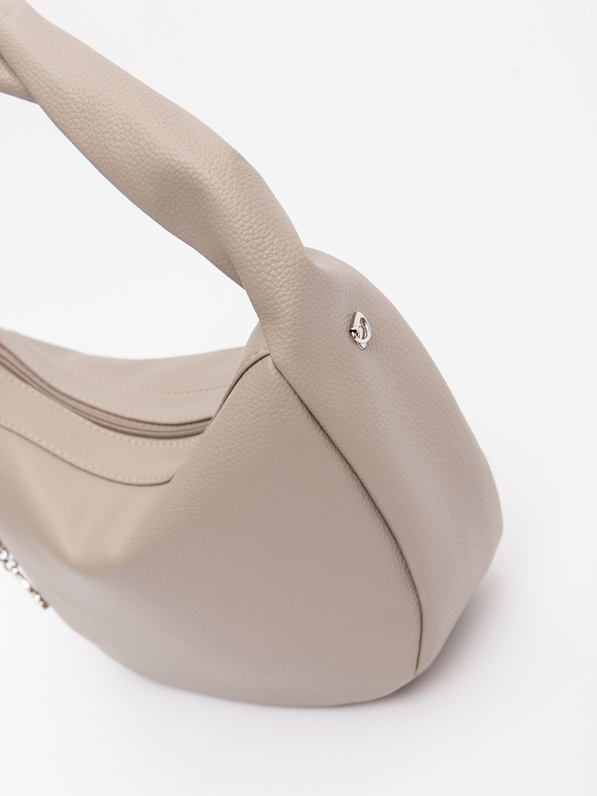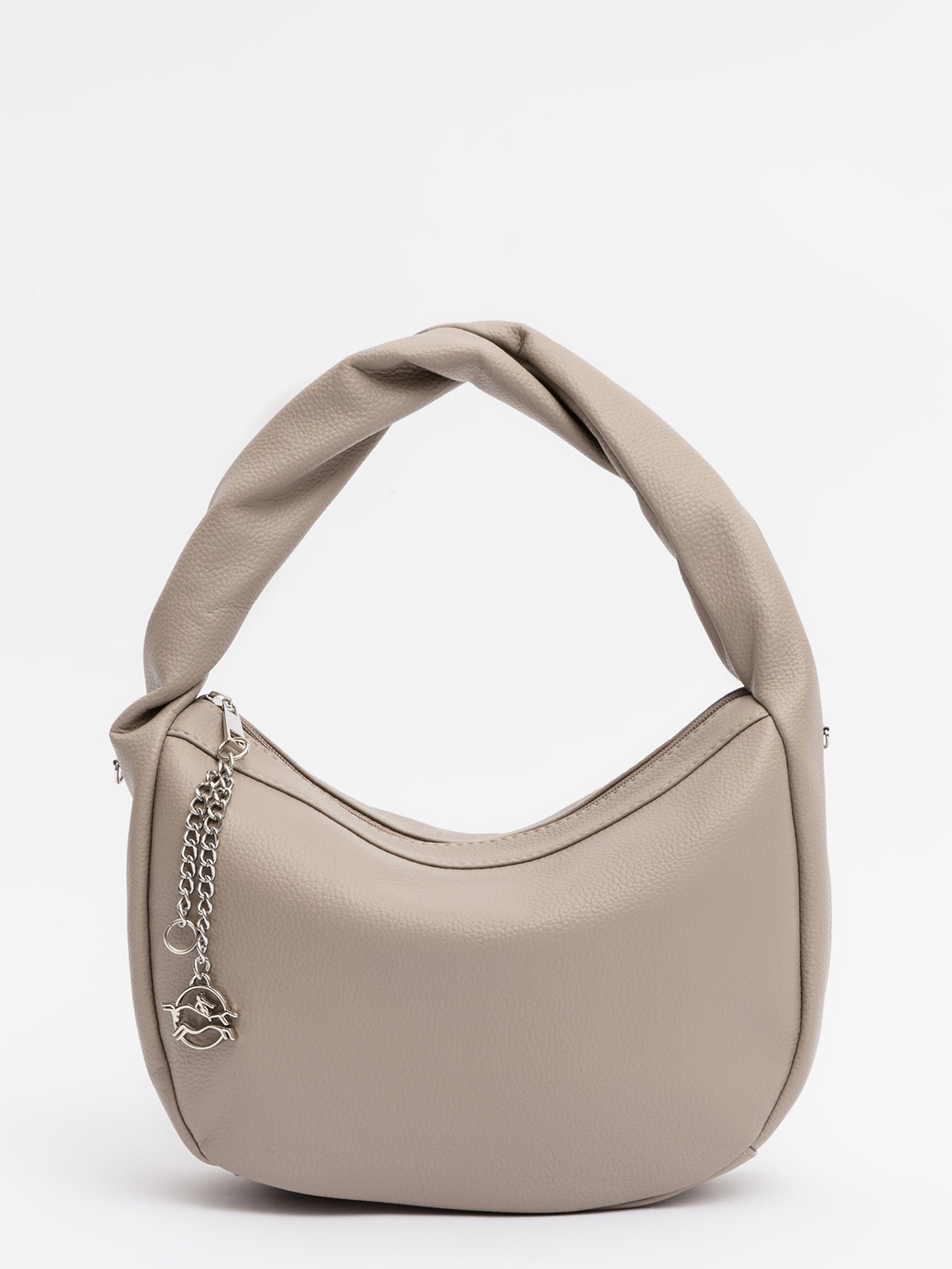 Мягкая округлая форма с эффектной перекрученной ручкой создаёт красивые драпировки, придавая образу лёгкую небрежность. Съёмный ремень позволяет носить сумку как кросс-боди через плечо или на плече, а стильный подвес на молнии можно менять, подстраиваясь под настроение.