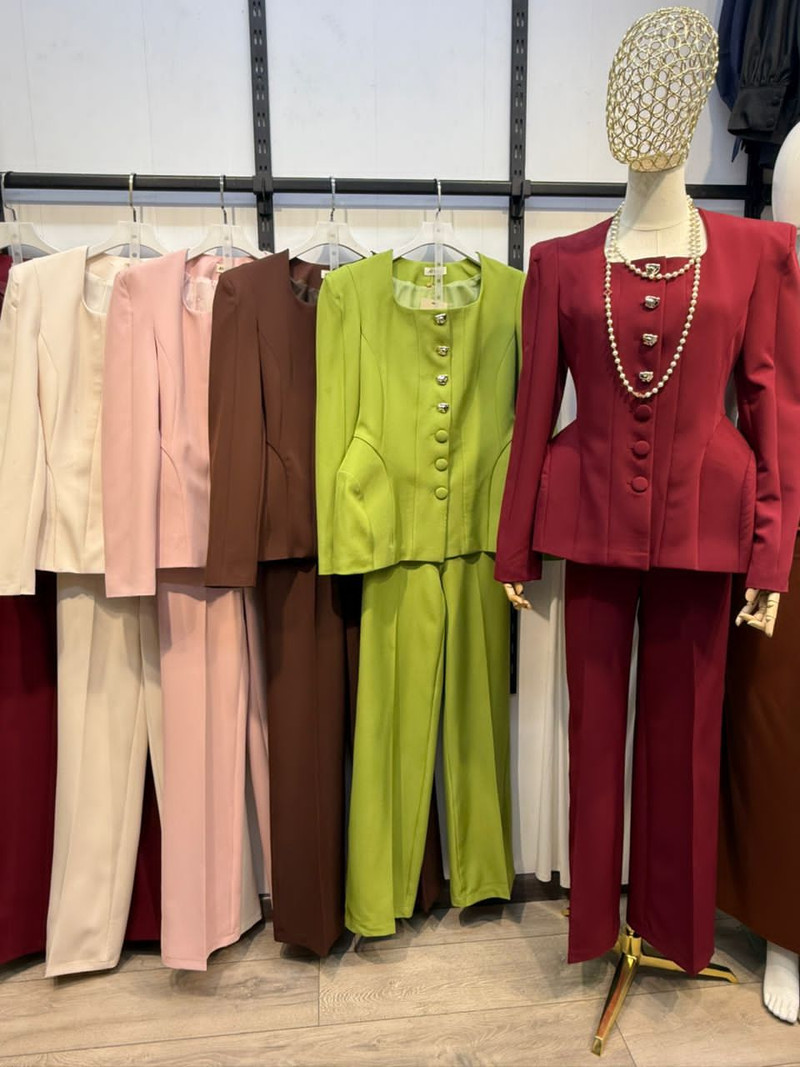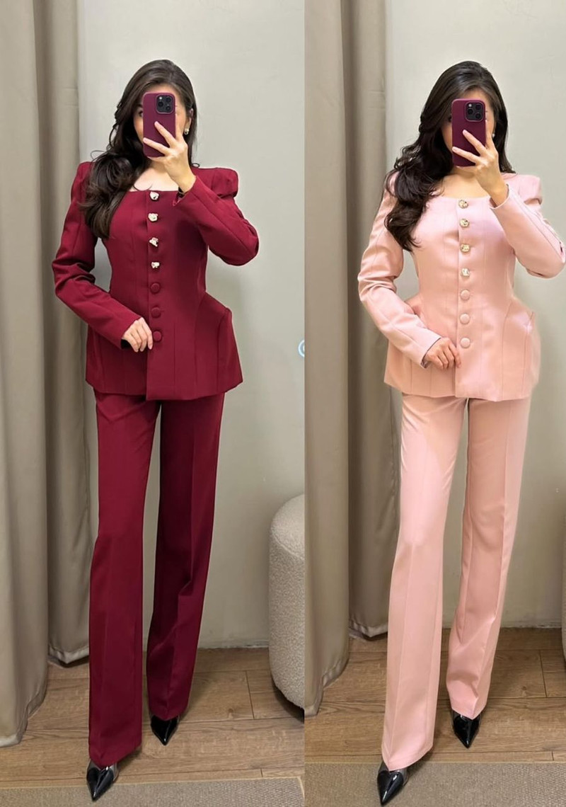 Приталенный жакет с акцентными плечами и декоративными пуговицами, классические прямые брюки со стрелками. Элегантный и женственный образ для работы, мероприятий и особых случаев.