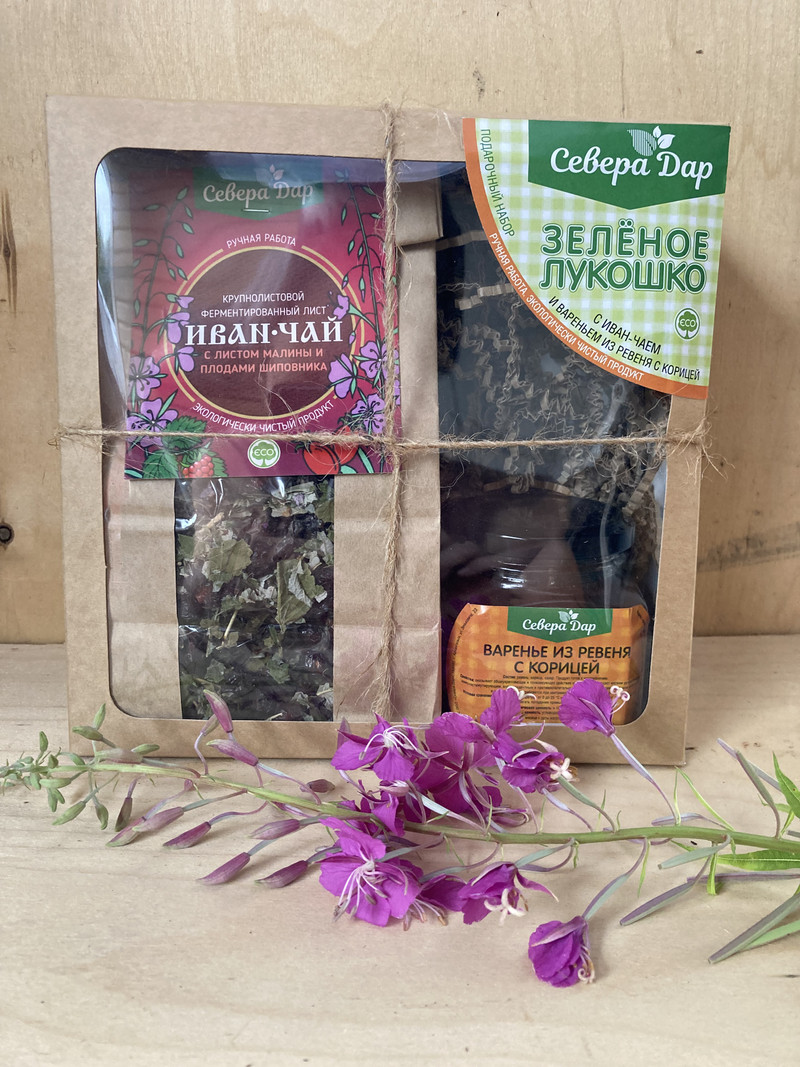 Подарочный набор “Зелёное лукошко”. Состав: ферментированный листовой иван-чай с листом малины и плодами шиповника, 100 г и варенье из ревеня с корицей, 250 г.