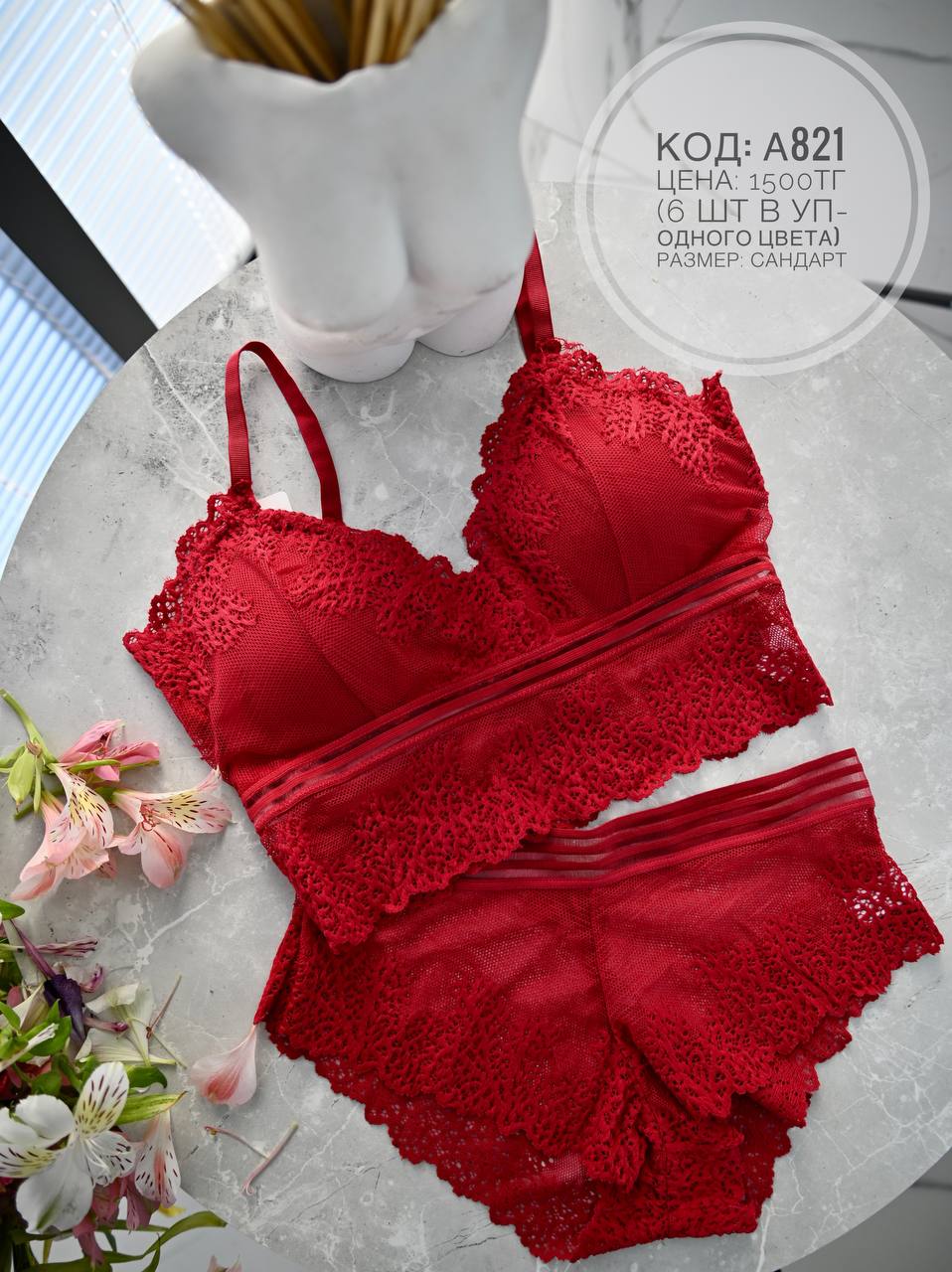 Чтобы купить А821 бордо комплект оптом по цене по запросу, свяжитесь с поставщиком. Компания поставщик — Shantal lingerie из города Алматы. Минимальная сумма оптового заказа: 5000 руб. Доставка возможна транспортной компанией, курьером, самовывоз, авиатранспортом, автомобилем, железной дорогой. Способы оплаты: безналичная оплата, наличными.