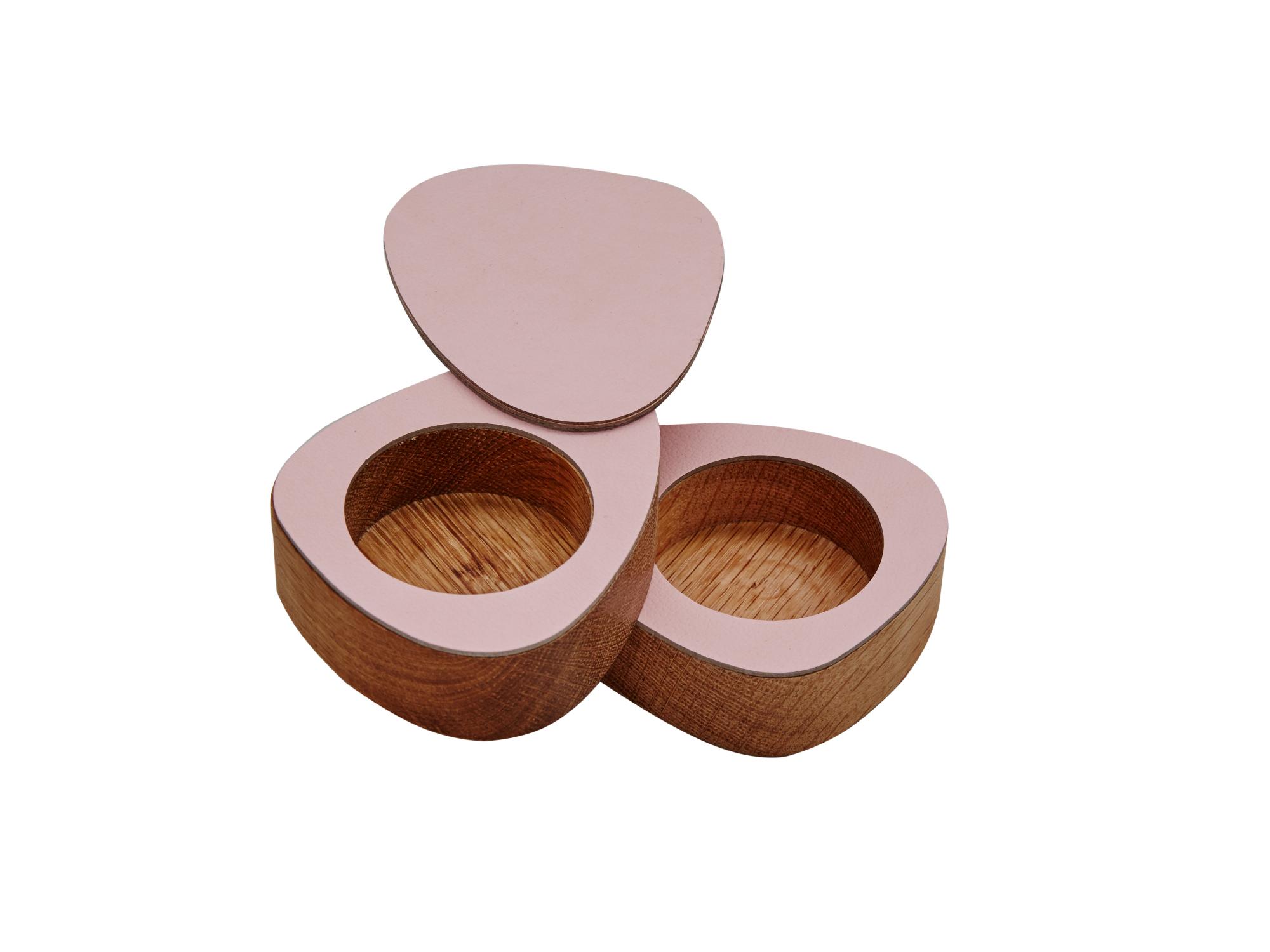 Отделка солонки/перечницы может быть выполнена из переработанной кожи различных цветов и выделки, основа прибора – полированный дуб.