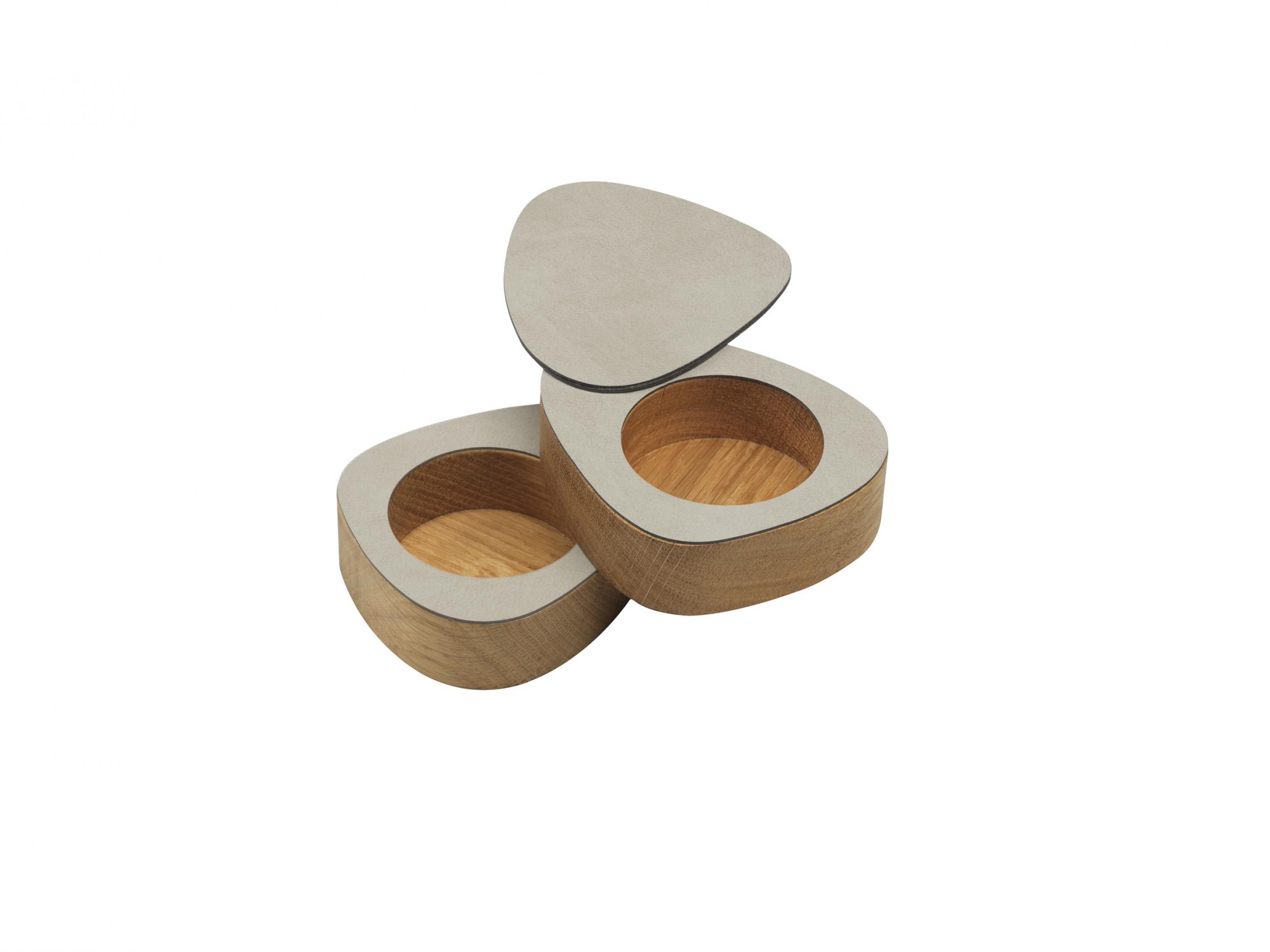 Отделка солонки/перечницы может быть выполнена из переработанной кожи различных цветов и выделки, основа прибора – полированный дуб.