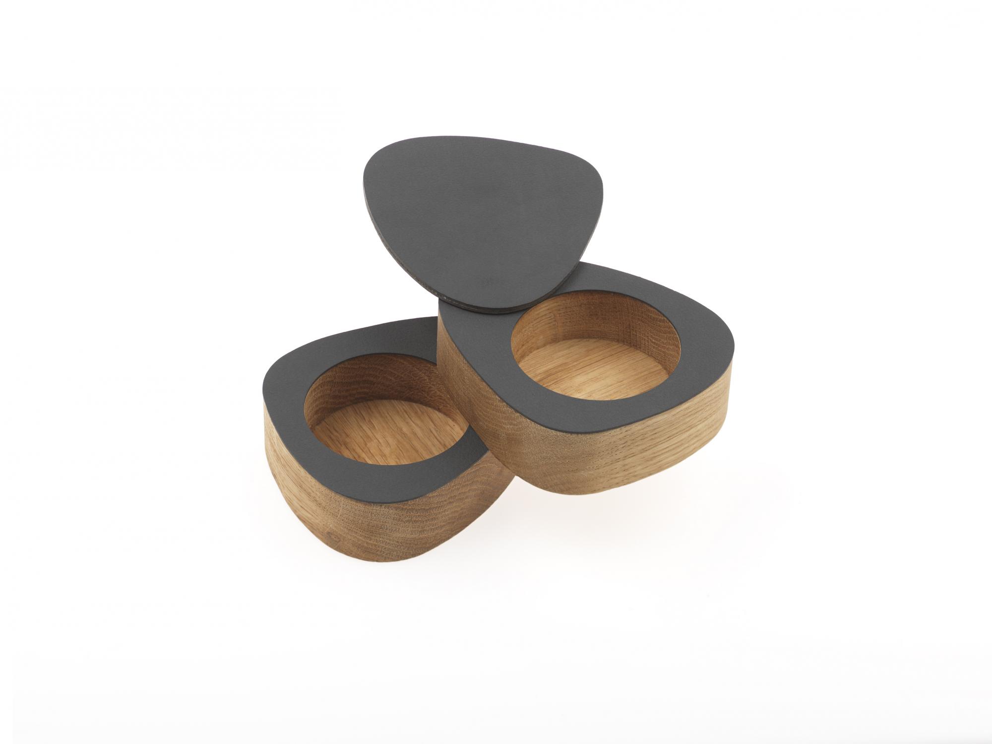 Отделка солонки/перечницы может быть выполнена из переработанной кожи различных цветов и выделки, основа прибора – полированный дуб.