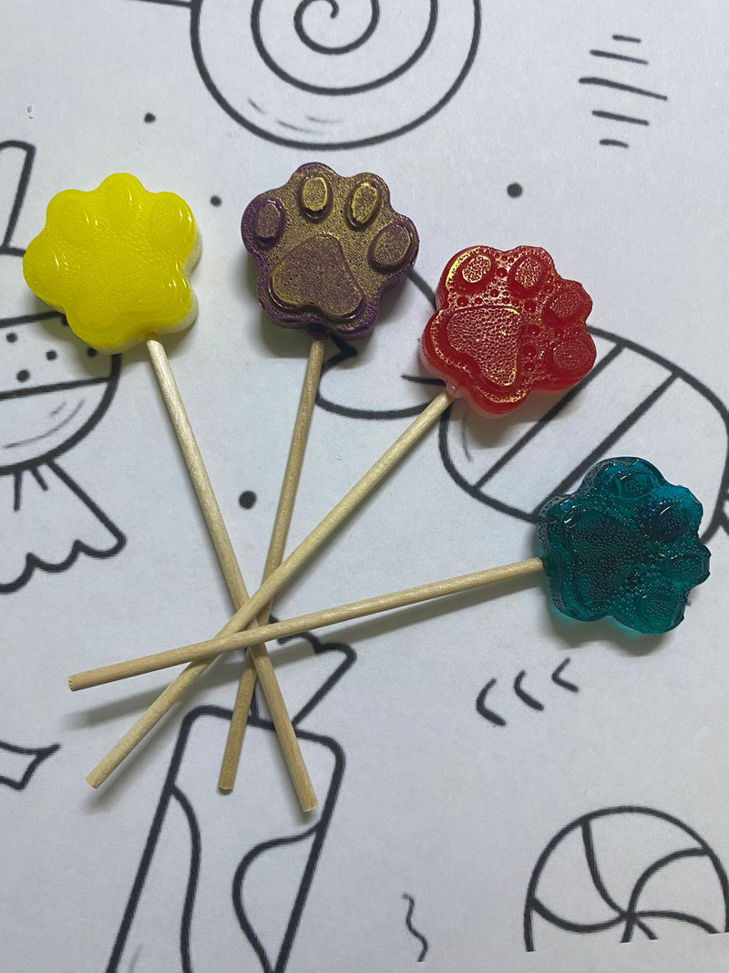 Вашему вниманию предлагаем леденцы на палочке из изомальта в форме лапки. Возможны любые вариации цвета и украшений. Вес 15 гр.