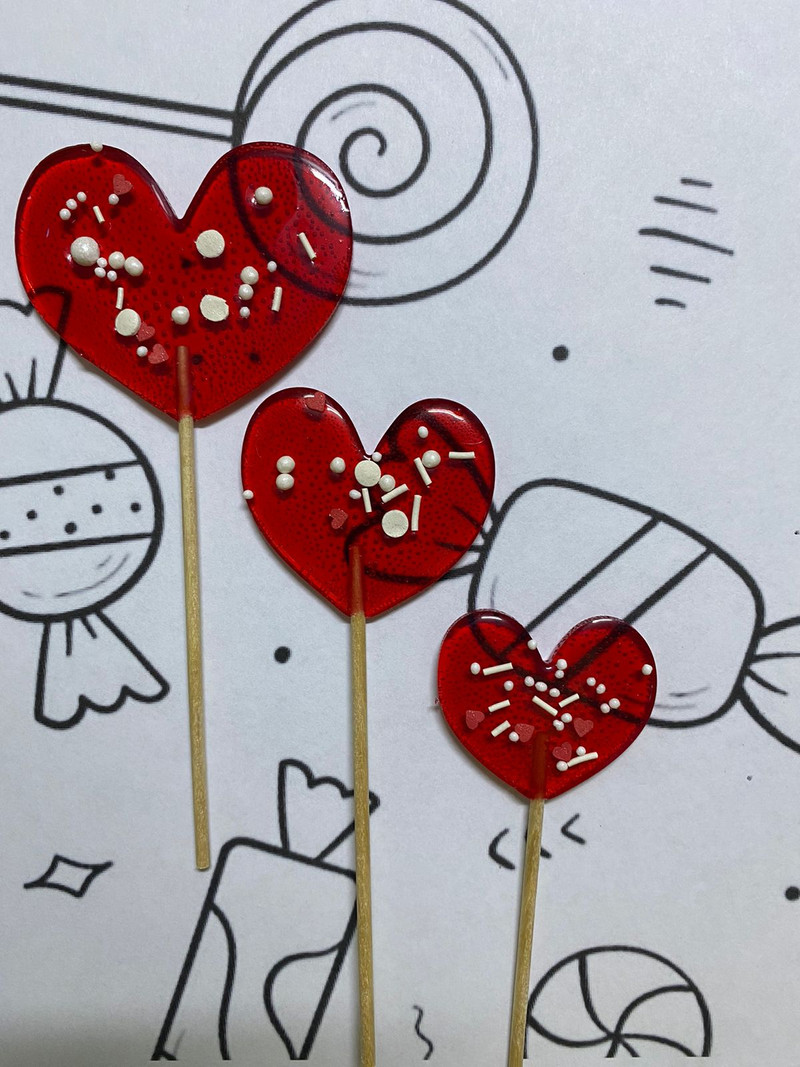 Вашему вниманию предлагаем леденцы на палочке из изомальта в форме сердец. Возможны любые вариации цвета и украшений. Вес 10 гр 15 гр 20 гр.