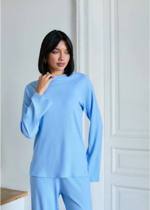 Фактурная ткань с вертикальной вязкой визуально вытягивает силуэт, подчеркивая фигуру и придавая образу изысканность. Комплект состоит из свободного лонгслива и брюк прямого кроя — базовое решение для офиса, прогулок и путешествий.