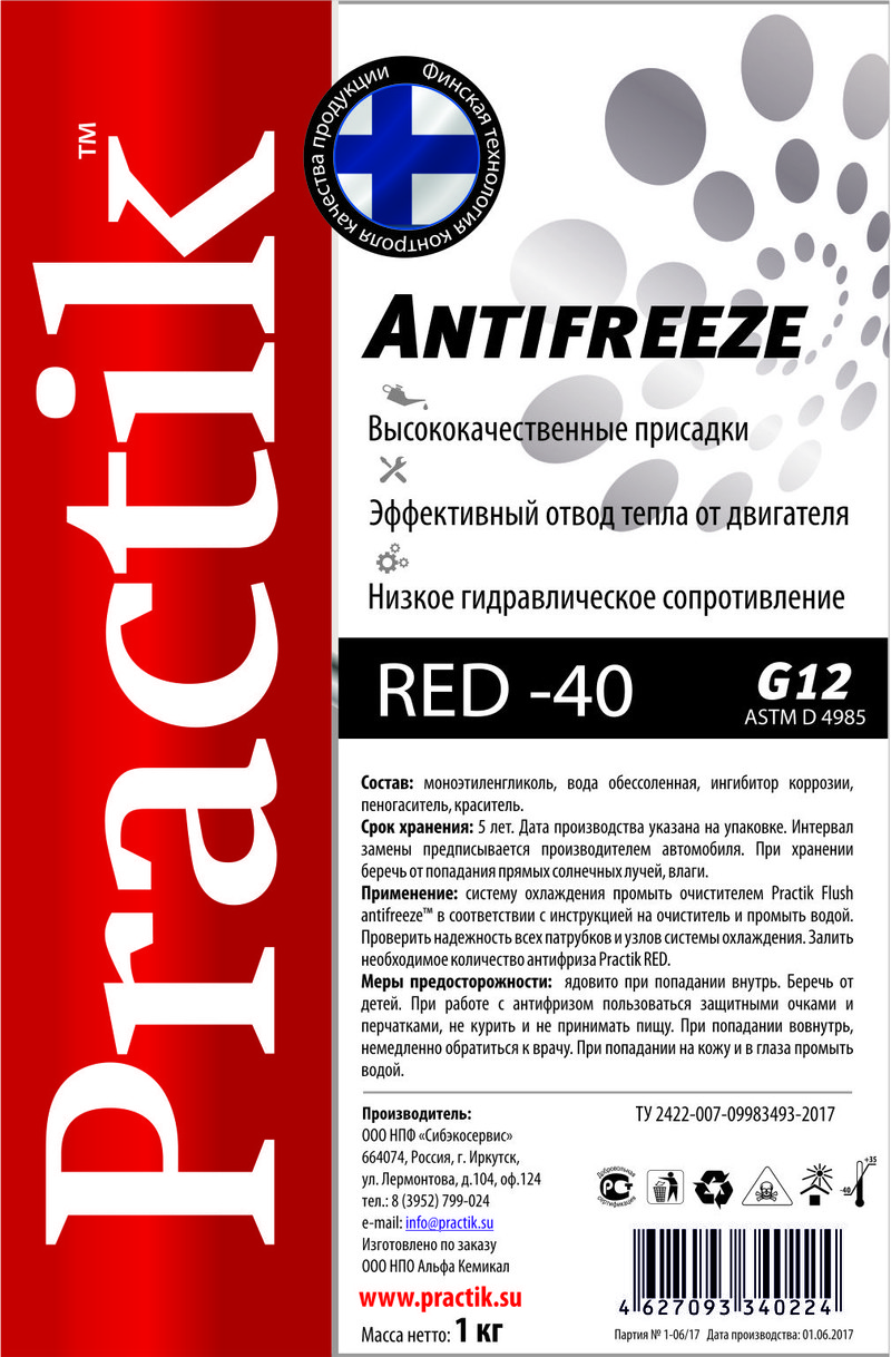 Чтобы купить Антифриз Practik Red G12 оптом по цене по запросу, свяжитесь с поставщиком. Компания поставщик — Сибэкосервис (ООО «Сибэкосервис») из города Иркутск (Иркутская область). Минимальная сумма оптового заказа: 10000 руб. Минимальная партия 1000 шт. Доставка возможна самовывоз, транспортной компанией, автомобилем, железной дорогой. Способы оплаты: наличными, безналичная оплата, кредитные карты, электронные деньги.