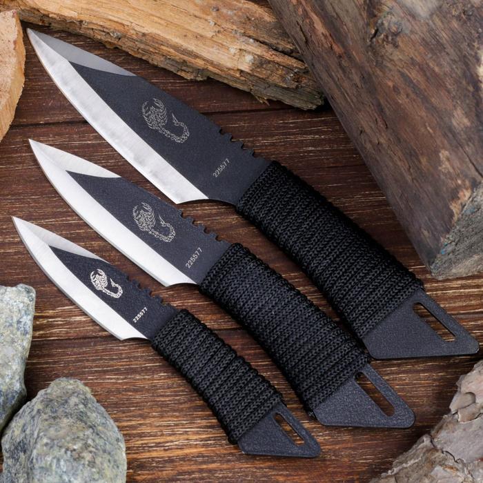 Набор метательных ножей "Скорпион", в оплётке, 3 шт., чёрные неотъемлемое условие любого похода. С ним вы будете чувствовать себя уверенным и защищенным. Этот нож выручит вас в любой форс-мажорной ситуации. Ручка в текстильной оплетке не позволит выскользнуть ему из рук в самый неподходящий момент. Удобные ножны крепятся к поясу или пуговице, обеспечивают быстрый доступ к оружию и его безопасной переноски.