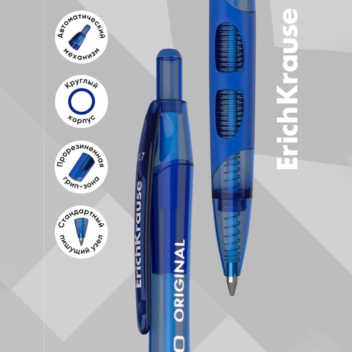 Автоматическая шариковая ручка Matic&Grip со стандартным типом пишущего узла и заменяемым стержнем. Цвет корпуса, грип-зоны и клипа соответствует цвету чернил. 5-канальный пишущий узел в сочетании с быстросохнущими чернилами обеспечивает мягкое и быстрое письмо. Модель XR-30 Matic&Grip Original 0.7 стала одним из бестселлеров в ассортименте автоматических ручек ErichKrause.ХарактеристикиМатериал корпуса: пластикПокрытие корпуса: глянцевоеЦвет корпуса: синийФорма корпуса: круглаяДиаметр корпуса, мм: 10Металлический клип: нетВентилируемый колпачок: нетТип пишущего узла: стандартный (пулевидный)Толщина линии, мм: 0.35Диаметр шарика, мм: 0.7Максимальная длина непрерывной линии, м: 1000Цвет чернил: синийТип чернил: стандартной вязкости (Ultra Glide Technology)Грип-зона: резиновая, эргономичнаяЗаменяемый стержень: да.