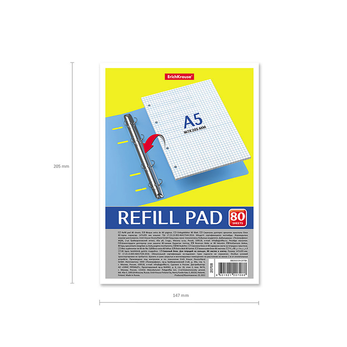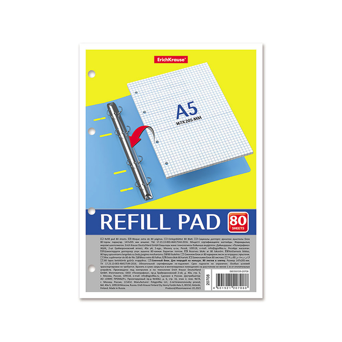 Сменный блок для тетрадей на кольцах формата А5 (147 х 205 мм). Благодаря плотной верхней обложке блок не деформируется. 80 листов в клетку. Бумага офсетная плотностью 60 г/м2. Цвет линовки - синий. Перфорация под кольца. Имеет индивидуальную упаковку в термоусадочную пленку.Вид линовки: клетка;Вид бумаги: офсетная;Белизна бумаги, %: 100;Поля: нет.