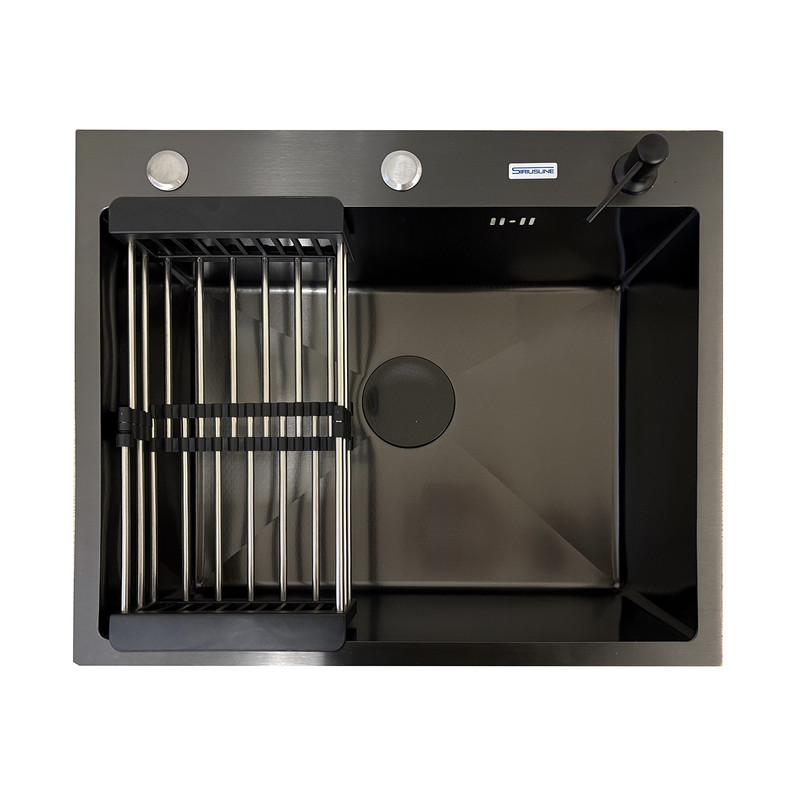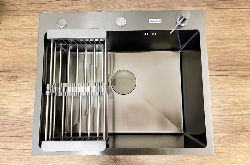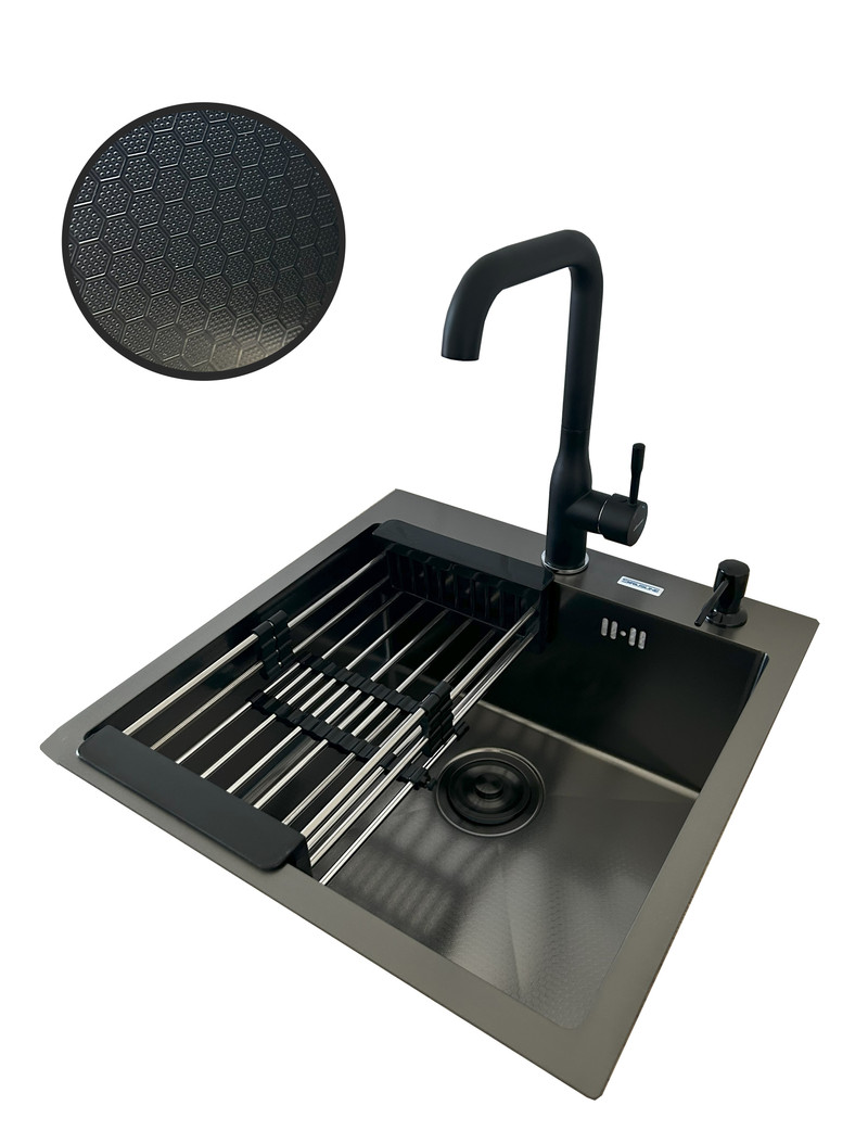 Мойка для кухни врезная, 60х50 см — поверхность с PVD-покрытием и тиснением “Соты” - это стильное и практичное решение для вашей кухни. Она выполнена из прочной нержавеющей 201 марки стали в цвете графит, что придает ей элегантный вид. Бортик мойки имеет толщину 3 мм, а чаша — 1 мм, обеспечивая надежность и долговечность.