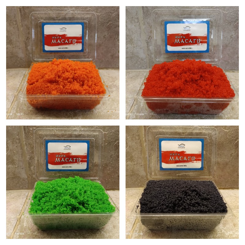 Прямое предложение от производителя. Икра масаго в ассортименте 4 цветов: красная, оранжевая, зеленая, черная. В коробе 20шт. Икра сделана из 100% зрелой икры сельди. Доставка включена в стоимость в пределах Москвы при заказе от 35 тыс. руб, осуществляем подвоз до ТК для отправки в регионы.