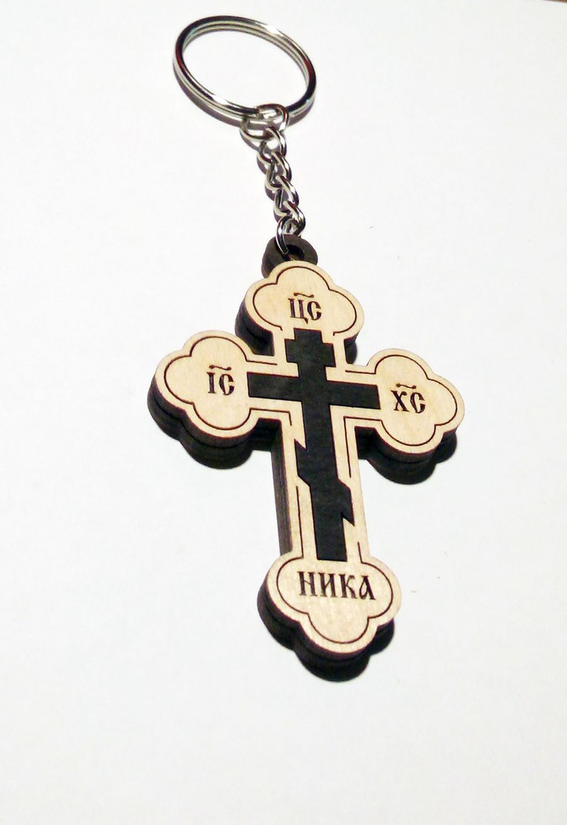 Брелок из березовой фанеры в два слоя. Изящный крестик с выгравированной надписью “Спаси и сохрани”.Отличный оберег и стильный аксессуар для ключей или сумки.
