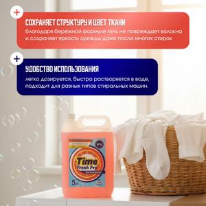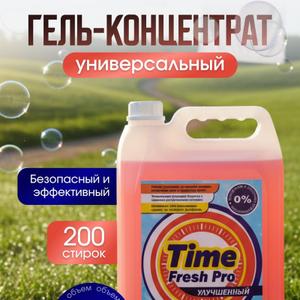 Новый универсальный гель-концентрат для стирки «Time Fresh Pro» разработан ведущими технологами на основании многолетних исследований и пожеланий покупателей. Рекомендован специалистами по ремонту стиральных машин (не содержит агрессивных компонентов, что на прямую влияет на состояние узлов и агрегатов и соответственно продлевает срок службы стиральных машин).Тестировался продолжительный период времени показав высокий результат. Благодаря гелеобразной концентрированной форме достигается высокое качество стирки при использование меньшего количества средства, что позволяет достигнуть существенной экономии.