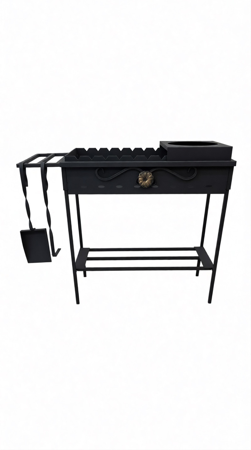 Полная комплектация “всё в одном”: подказанник, кочерга, совок для золы и удобная дровница (нижняя полка).