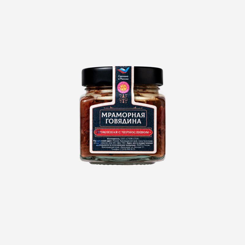 Говядина категории А, чернослив, соль, лук репчатый, перец черный, лавровый лист, соевый соус.