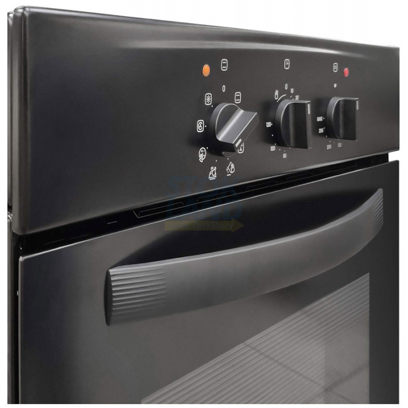 Электрический духовой шкаф черного цвета с эмалированным фасадом, простым механическим управлением и таймером. Многофункциональный бытовой прибор, с приятным дизайном и всем необходимым для полноценной эксплуатации, отличный вариант для приобретения. Режим работы и температура регулируются двумя поворотными ручками, есть индикация включения нагрева. Классический нагрев (верхний и нижний) оснащен термостатом, автоматически поддерживающем температуру в диапазоне 100-250 градусов, дополнительным режимом включается мощный гриль работающий вместе с вентилятором (конвекция). В центре панели управления установлен таймер, достаточно выставить время приготовления и по окончании прозвучит сигнал, напоминая о необходимости проверить готовящееся блюдо. Двойное стекло дверцы удерживает жар внутри шкафа, не снижая температуры нагрева. Направляющие для противней выполнены съемными и легко чистятся.