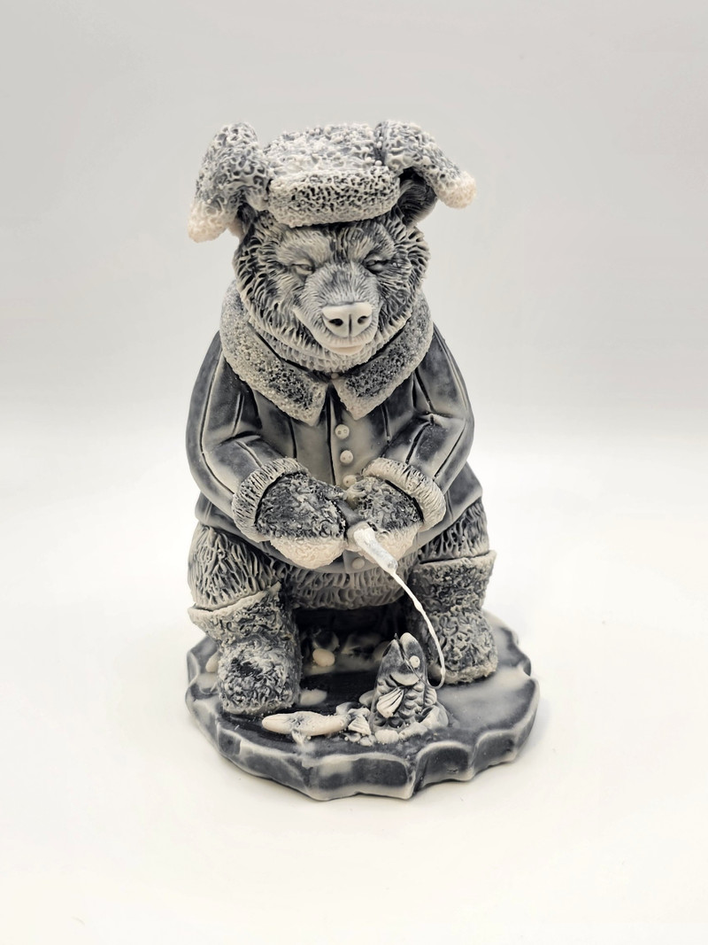 Медведь рыбак из мраморной крошки высотой 11 см — это изящная миниатюрная скульптура, сочетающая в себе природную мощь и трогательную хрупкость. Материал, мраморная крошка, придает изделию особую текстуру и благородство. Мелкие частицы мрамора, спрессованные вместе, создают эффект природного камня, с его неповторимыми прожилками и оттенками. Эта техника позволяет добиться реалистичной передачи фактуры медвежьей шерсти и прочих элементов.