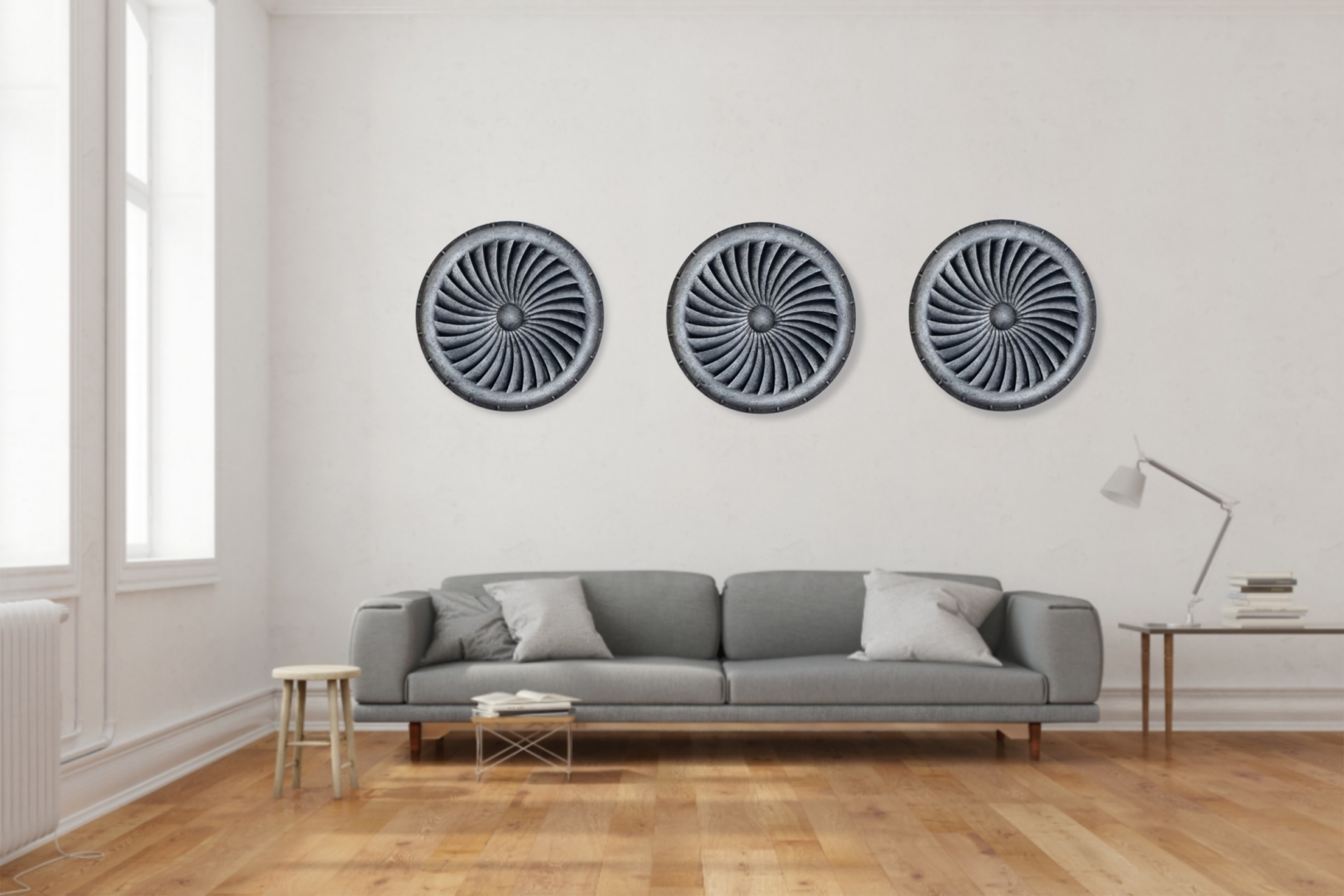 Декоративная самолетная турбина DS украсит стену в гостиной в индустриальном стиле. Авиационная турбина создана в технике скульптурного литья гипса в объемную форму. На стене такой интерьерный индустриальный лофт предмет смотрится очень эффектно. Лопасти турбины рельефные, почти, как настоящие. Визуальное сходство усиливает цвет металлической стали с легкими текстурными неровностями и черная патина внутри лопастей. Особенно впечатляет декоративная турбина большого размера. На заказ мы создаем акцентные предметы от 80см. в диаметре и до 170см. Вокруг такого декора на стене формируется вся декоративная композиция.