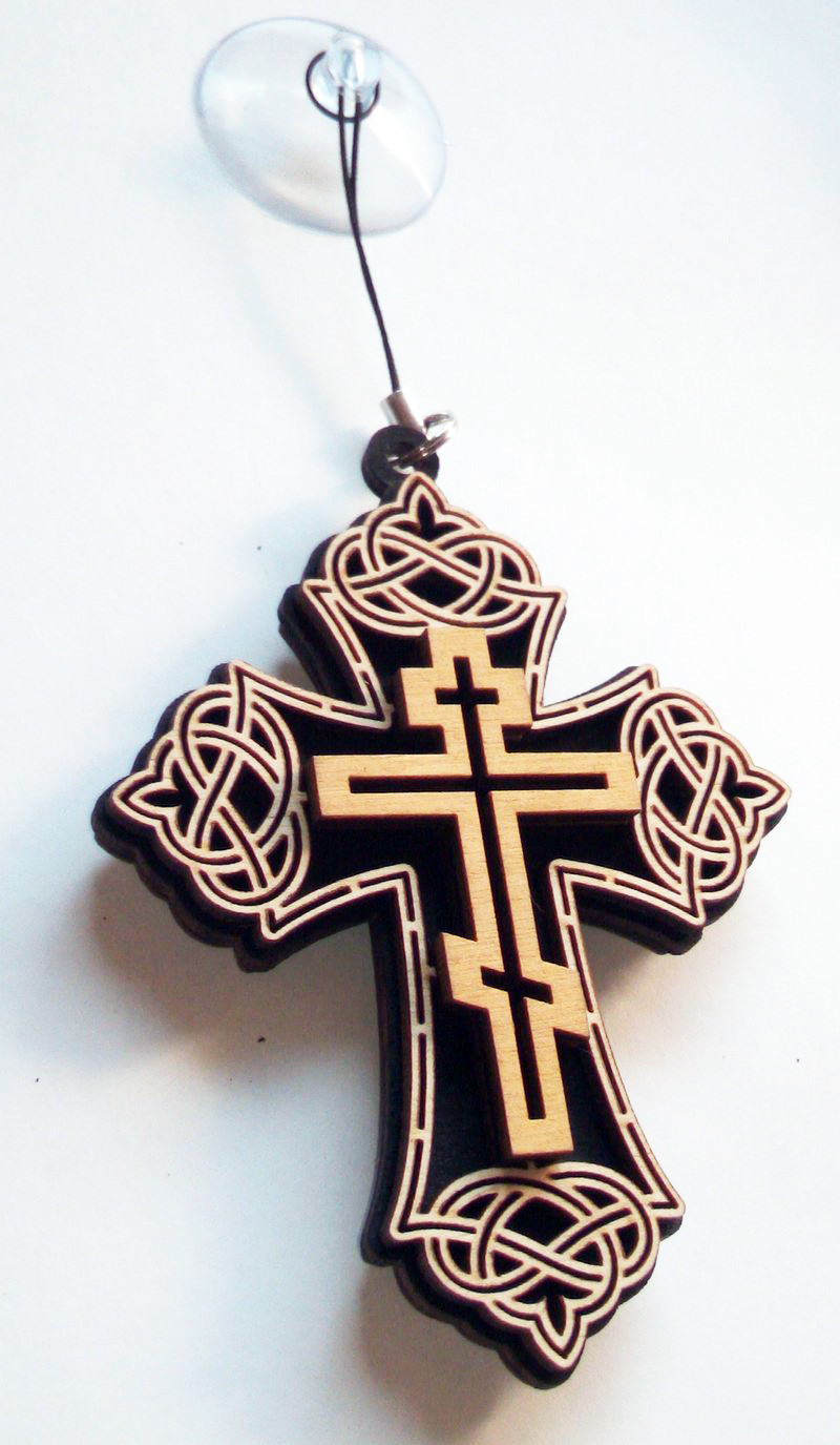 Крест на присоске, сувенир в авто-стильный оберег из фанеры с прорезным орнаментом.