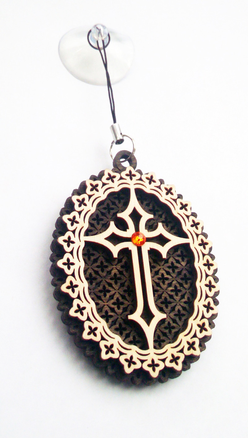 В центре изделия расположен крест более светлого дерева, почти кремового цвета. Крест имеет расширяющиеся концы. В месте пересечения его перекладин вставлен небольшой оранжевый камень.