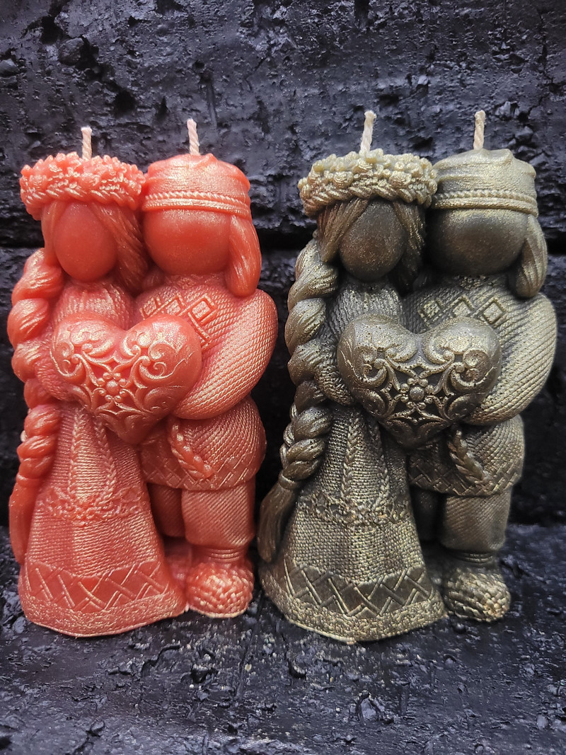 Свеча Неразлучники оберег любви — 100% натуральный пчелиный воск. По Вашему желанию можем изготовить в нескольких вариантах цвета воска. Свеча может быть совсем не окрашена, так же и окрашена водорастворимой свечной краской. По согласованию с заказчиком за доп плату — возможно добавление в свечу трав и/или эфирных масел.