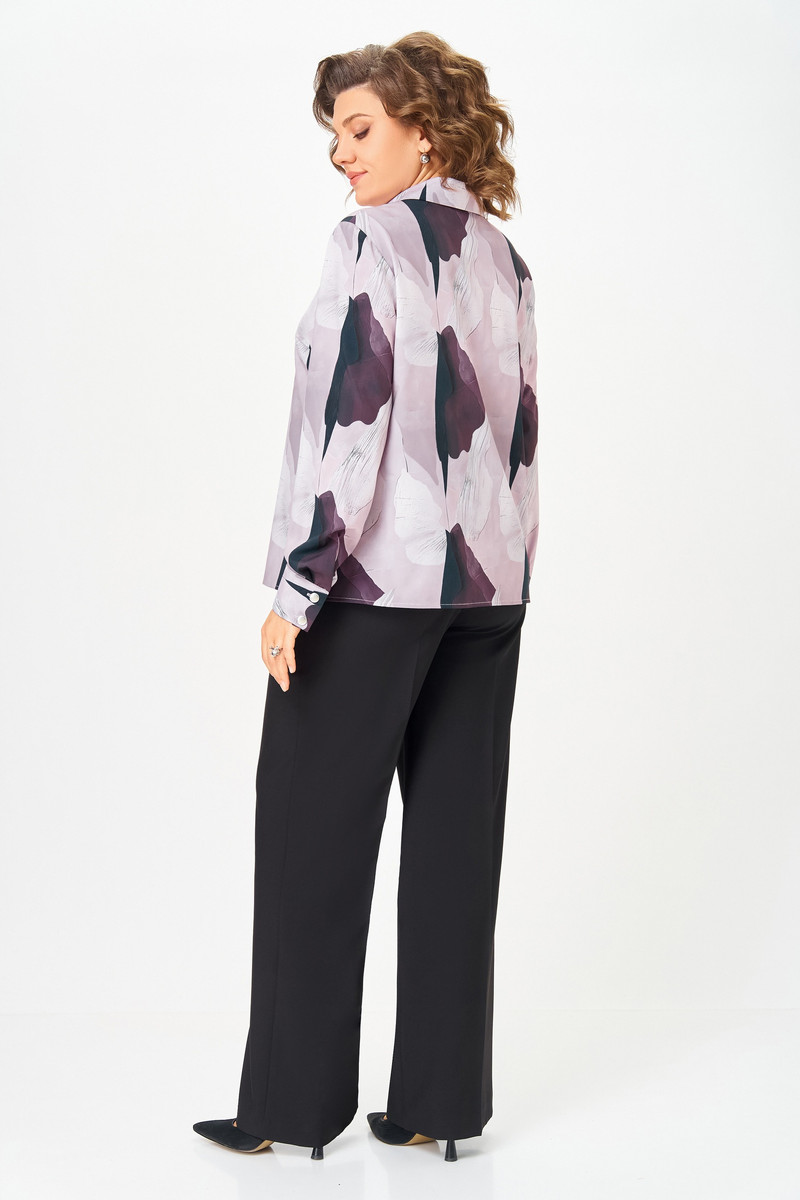 Блузка из вискозной ткани, прямого силуэта с центральной застёжкой на петли и декоративные пуговицы. Перед с нагрудными вытачками. Спинка цельная. Воротник рубашечного типа с отрезной стойкой. Рукав втачной одношовный с манжетой, которая застёгивается на две петли и пуговицы.