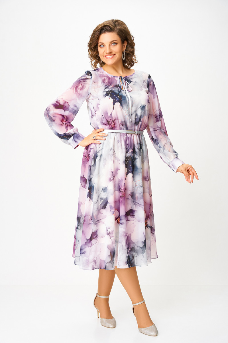 Платье из воздушной шифоновой ткани, на трикотажной подкладке, отрезное по линии талии, шов собран на эластичную тесьму-резинку. Горловина округлой формы, по переду капелька с завязкой. Рукав втачной одношовный, внизу со сборкой и манжетой, которая застёгивается на 2 петли и пуговицы.