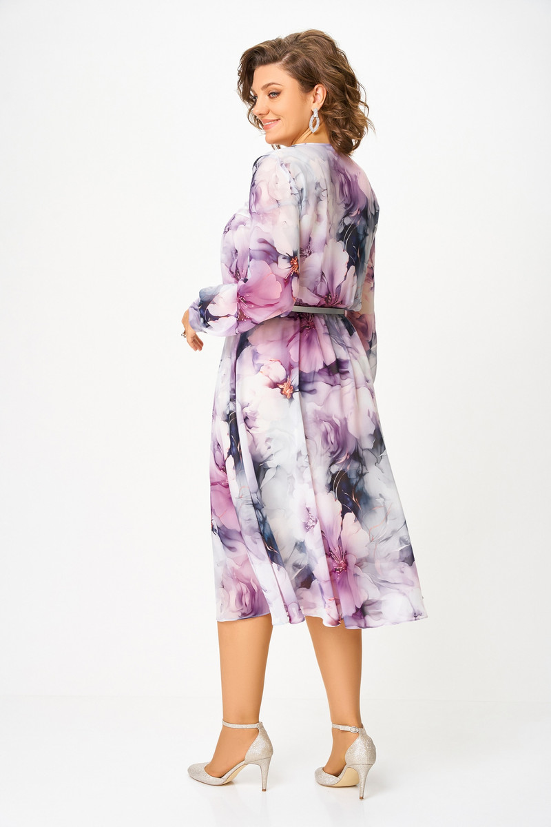 Платье из воздушной шифоновой ткани, на трикотажной подкладке, отрезное по линии талии, шов собран на эластичную тесьму-резинку. Горловина округлой формы, по переду капелька с завязкой. Рукав втачной одношовный, внизу со сборкой и манжетой, которая застёгивается на 2 петли и пуговицы.