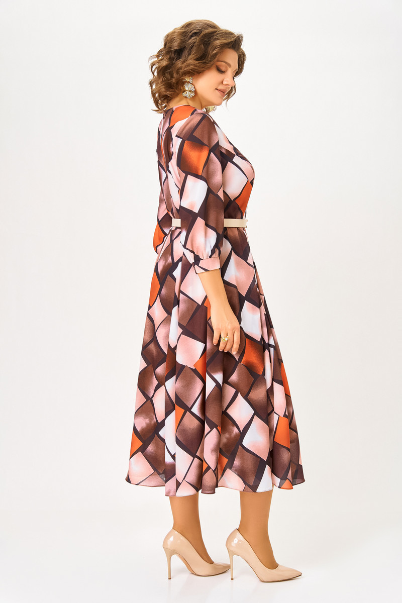 Платье из мягкой, струящейся вискозной ткани, Х-образного силуэта с полуприлегающим лифом. Платье отрезное по линии талии. По переду лифа расположены рельефы, по спинке лифа талиевые выточки. Юбка расклешенная из шести клиньев со встречными складками по линии талии. В среднем шве спинки предусмотрена молния. Рукав втачной длиной 3⁄4, по низу манжета с эластичной вставкой.