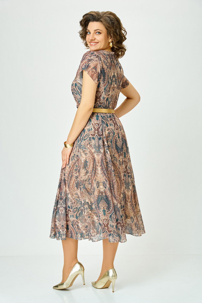 Платье из шифона на трикотажной подкладке, Х-образного силуэта с полуприлегающим лифом. Платье отрезное по линии талии. По переду лифа расположены рельефы, по спинке лифа талиевые выточки. Юбка расклешенная из шести клиньев со встречными складками по линии талии. В среднем шве спинки предусмотрена потайная тесьма- молния. Рукав втачной покроя тюльпан, длина рукава 15 см.