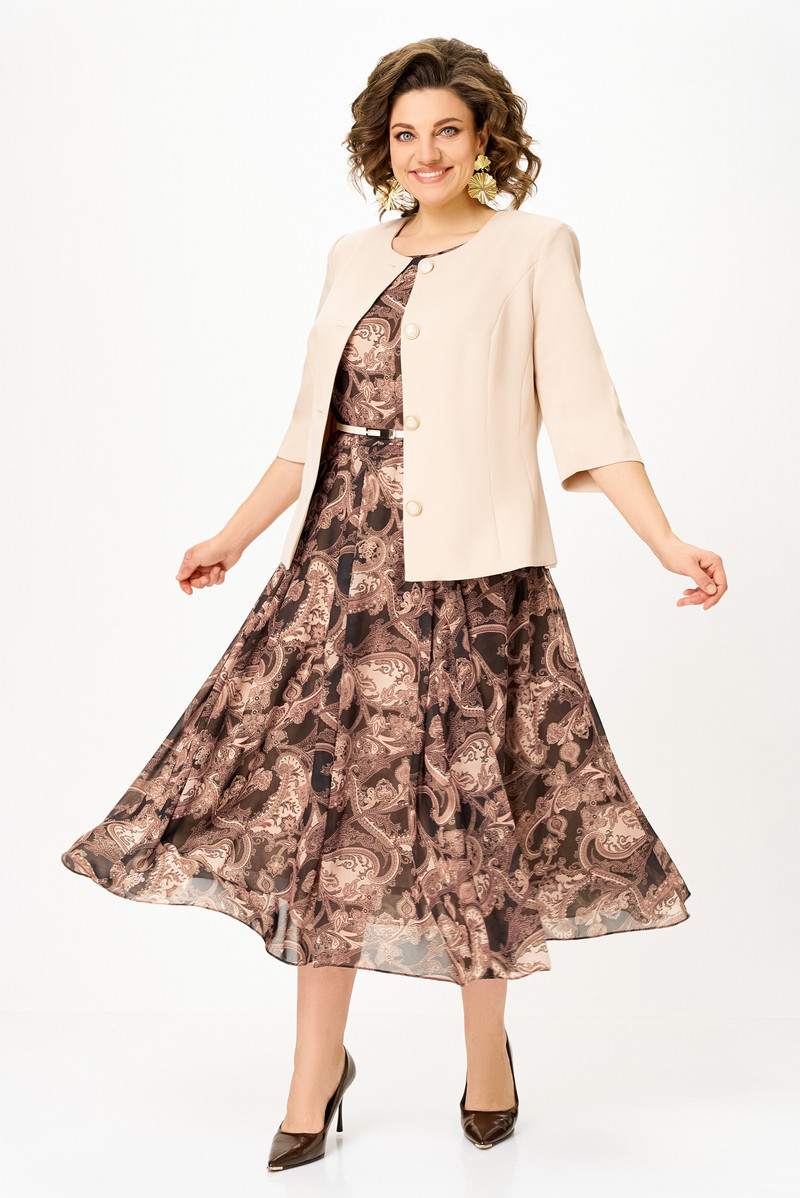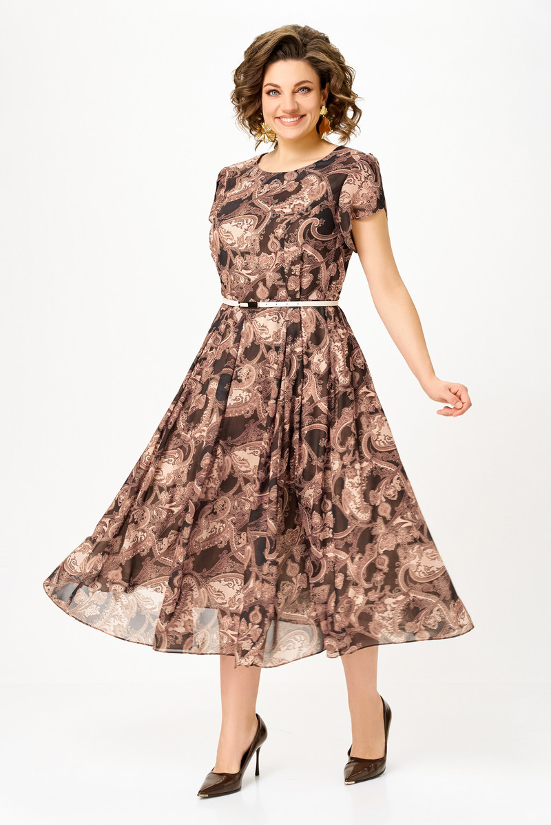 Платье из шифона на трикотажной подкладке, Х-образного силуэта с полуприлегающим лифом. Платье отрезное по линии талии. По переду лифа расположены рельефы, по спинке лифа талиевые выточки. Юбка расклешенная из шести клиньев со встречными складками по линии талии. В среднем шве спинки предусмотрена потайная тесьма- молния. Рукав втачной покроя тюльпан, длина рукава 15 см.