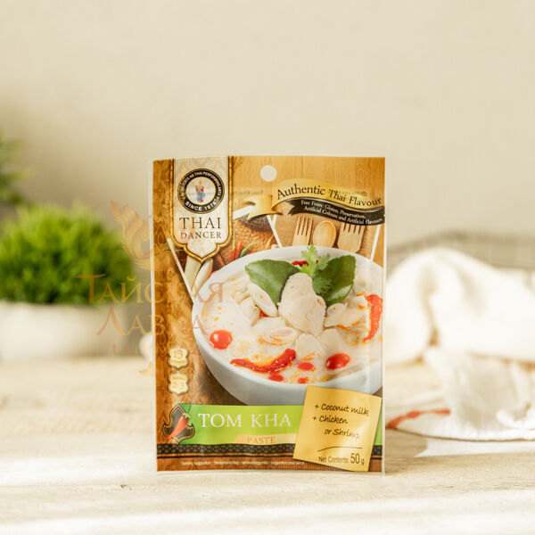 Ингредиенты: кокосовое молоко, 200 гр куриного мяса, порезанного на небольшие кусочки, либо 8-10 креветок, зелень, паста-основа. Рецепт: 1) влить в кастрюлю 240 мл воды и 240 мл кокосового молока, довести до кипения. 2) Добавить пасту Thai Dancer (все содержимое упаковки) и заготовленное мясо. 3) Варить до готовности мяса. 4) Готовое блюдо украсьте зеленью. По традиции, к супу Том Кха отдельно подают небольшую порцию отварного риса.