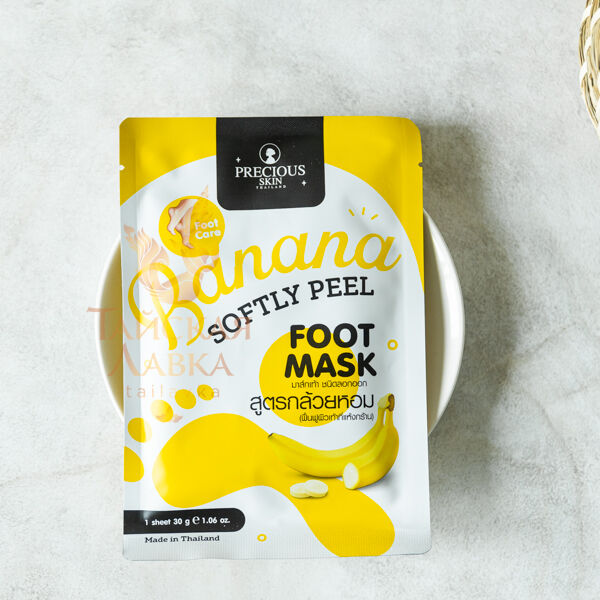 Облегчить процедуру домашнего педикюра и сделать ее быстрой и простой вам помогут носочки для пилинга с экстрактом банана. Быстро и бережно размягчают мозоли, натоптыши и огрубевшую кожу на ступнях и пальцах ног, отшелушивают мертвые клетки, активно увлажняют кожу и напитывают ее витаминами. Активные компоненты: мочевина, витамин В3, мед, гиалуроновая кислота, коллаген, экстракт банана, экстракт женьшеня.