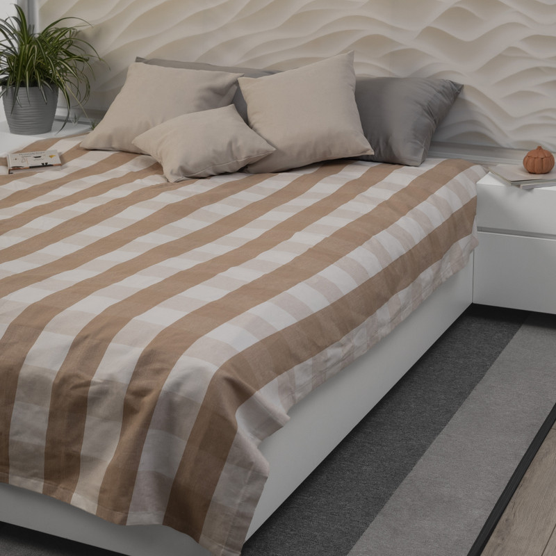 Льняное покрывало популярной расцветки, которое лаконично вольется в любой интерьер за счет своего спокойного цвета, а трендовая клетка добавит дому нотки комфорта.