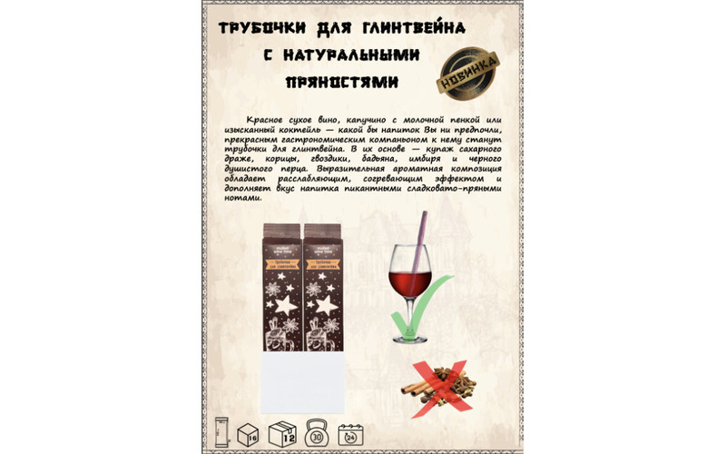 Каждая упаковка «Трубочек для Глинтвейна» упакована в индивидуальную обёртку, что делает продукт гигиеничным, удобным для продажи и раздачи. Такой формат упаковки ярко и эффектно смотрятся на витрине, в подарочных наборах и на столе, привлекая внимание покупателей.