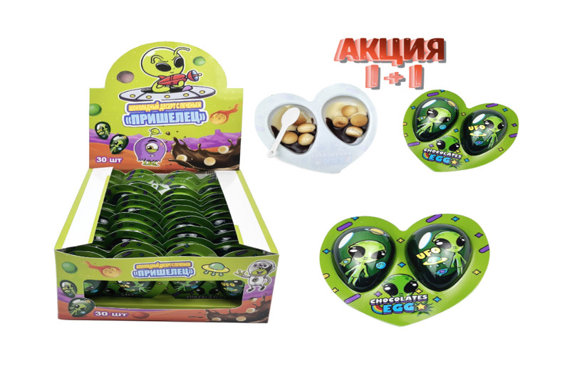 Шоколадная Глазурь с печеньем «Пришелец» 20*30*10г. В каждой половинке — вкусная нежная сливочно-шоколадная паста с хрустящим печеньем. Дсерт по вкусу напоминает киндер джой.