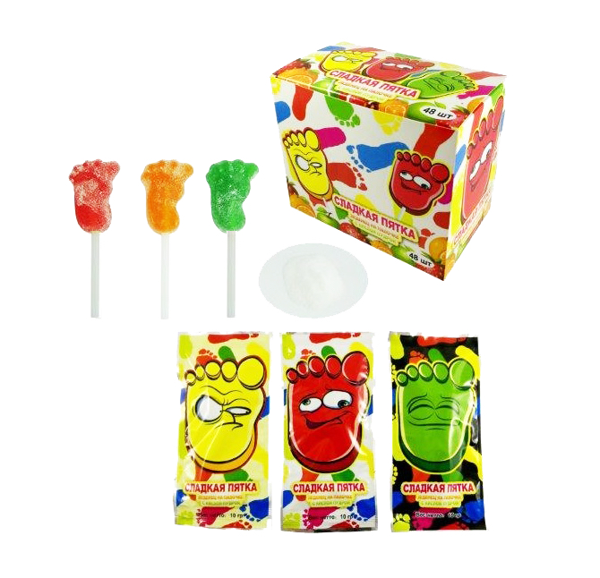 Карамель на палочке “Сладкая пятка” 12*48*10г — леденцовая карамель на палочке в виде пятки с кислой пудрой. В каждой упаковке — вкусные леденцы с разными вкусами: Яблоко, Кола, Арбуз, Тутти-Фрутти и Апельсин и сладкая пудра.