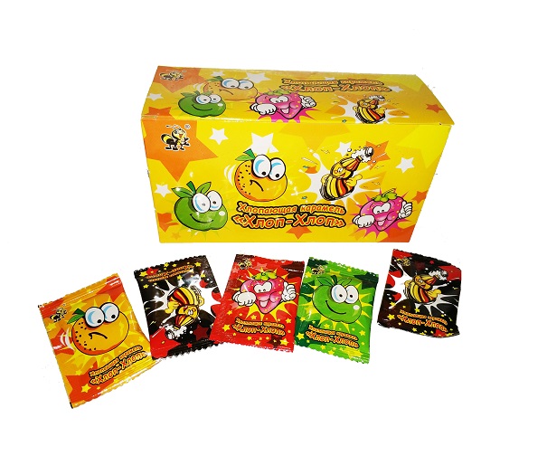 Хлопающая карамель Хлоп-Хлоп — изготавливается в Китае по нашему заказу. Технология использования проверена временем — только качественные ингредиенты и натуральные красители.