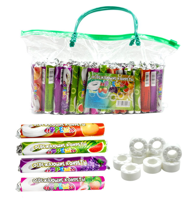 Конфета “Фреш” 30*70*5,2 г — это вкусное освежающее драже со вкусом апельсина, лимона, клубники, вишни, мяты, ментола. Конфеты обладают приятным освежающим вкусом. ФРЕШ — это таблетированные конфеты по форме напоминающие аскорбинку (аскорбиновую кислоту), их удобно брать с собой благодаря небольшой и удобной упаковке в виде стика. Эти сладкие конфеты освежают дыхание после еды и могут заменить жевательную резинку или мятную карамель (леденец). А еще они избавят от тошноты в длительной поездке — благодаря освежающему вкусу и небольшому размеру, сладости можно взять с собой в самолет или машину.
